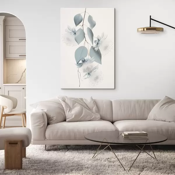 Wandbilder Eukalyptuszweig mit blauen Blättern und weißen Blüten, heller Hintergrund Art. s45947