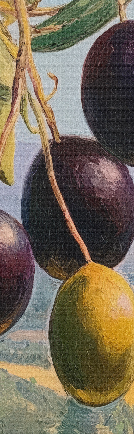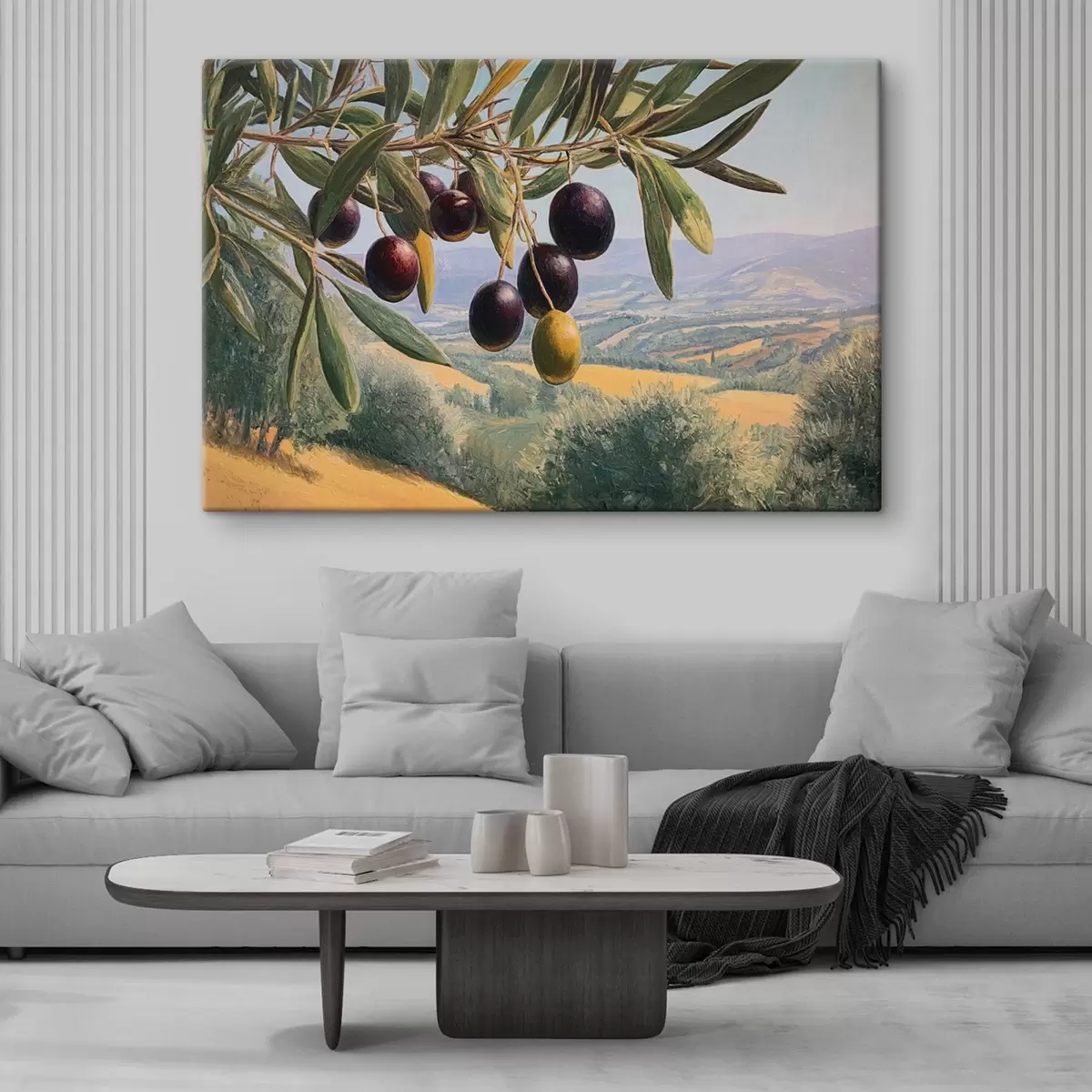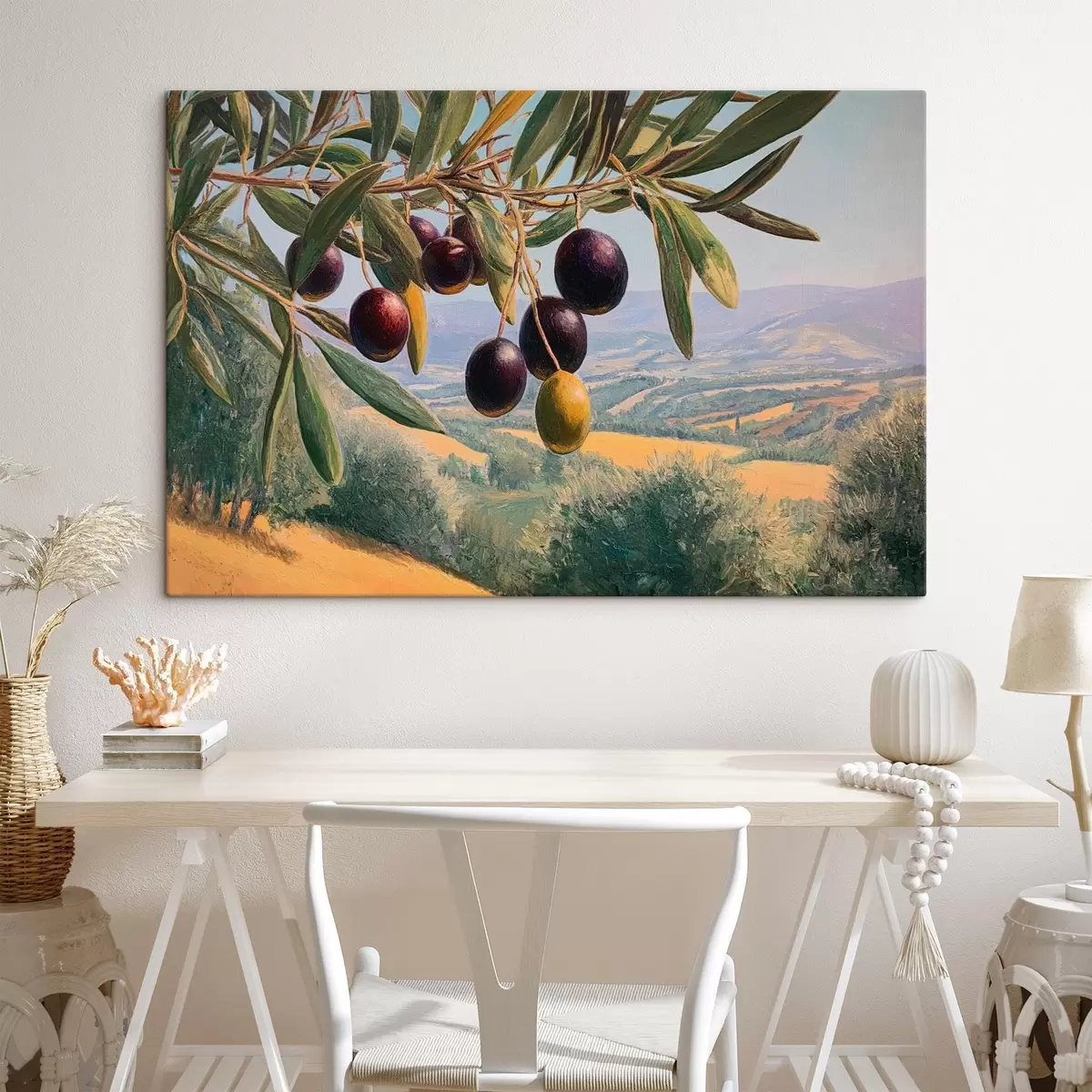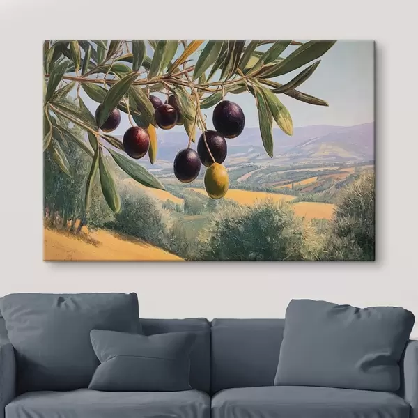Wandbilder Olivenzweig mit dunklen Früchten vor einer Sommerlandschaft Art. s46150