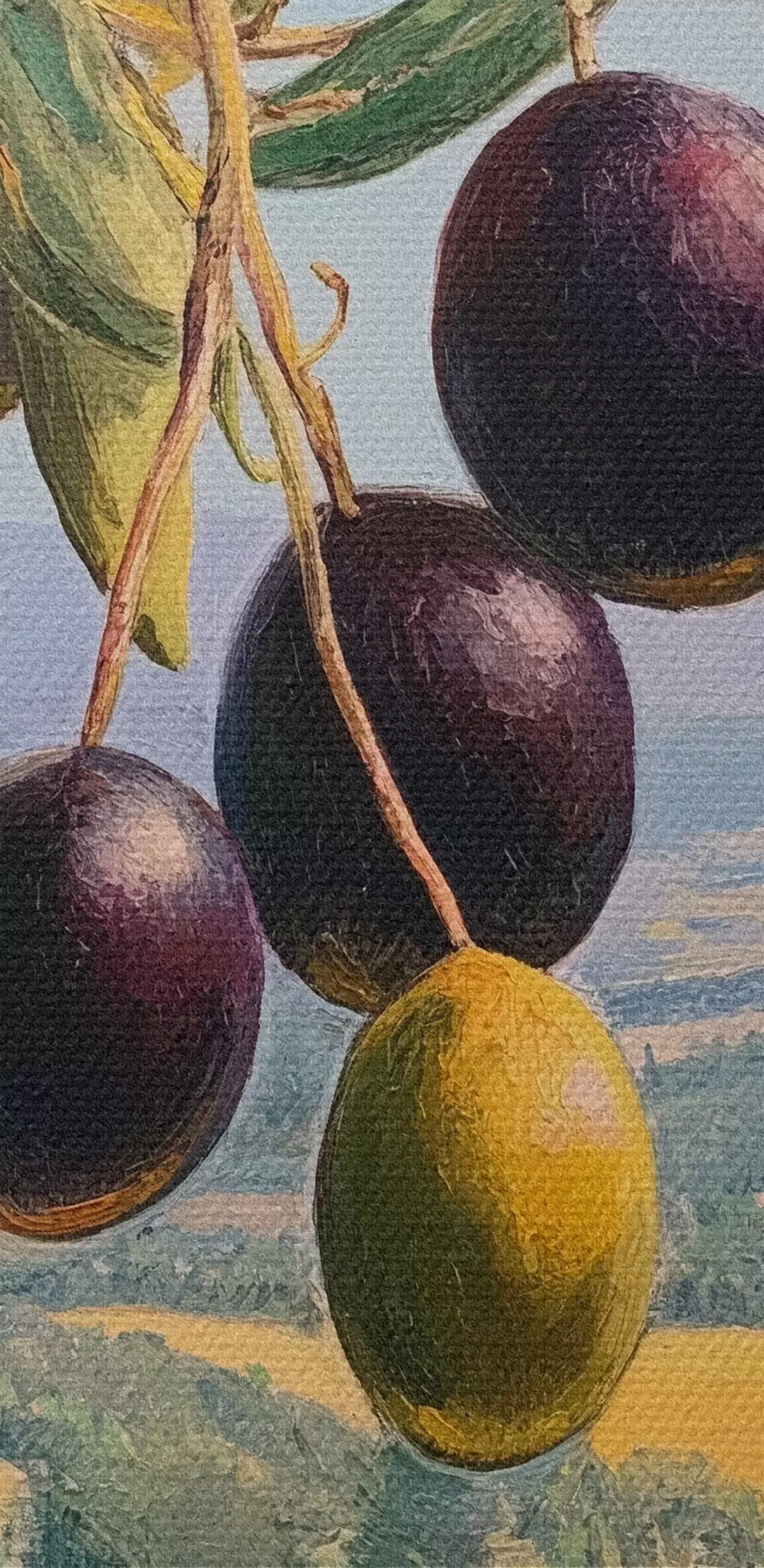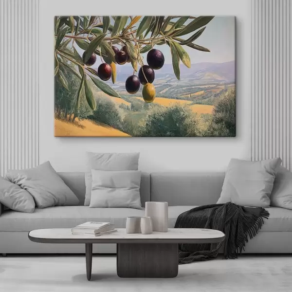 Wandbilder Olivenzweig mit dunklen Früchten vor einer Sommerlandschaft s46150