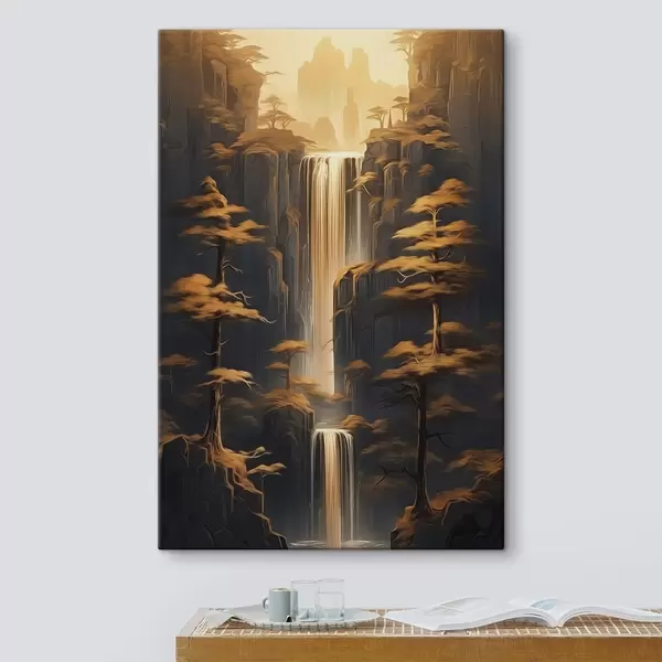 Wandbilder Hohe Klippen mit einem Wasserfall und Kiefern im Abendlicht s46151