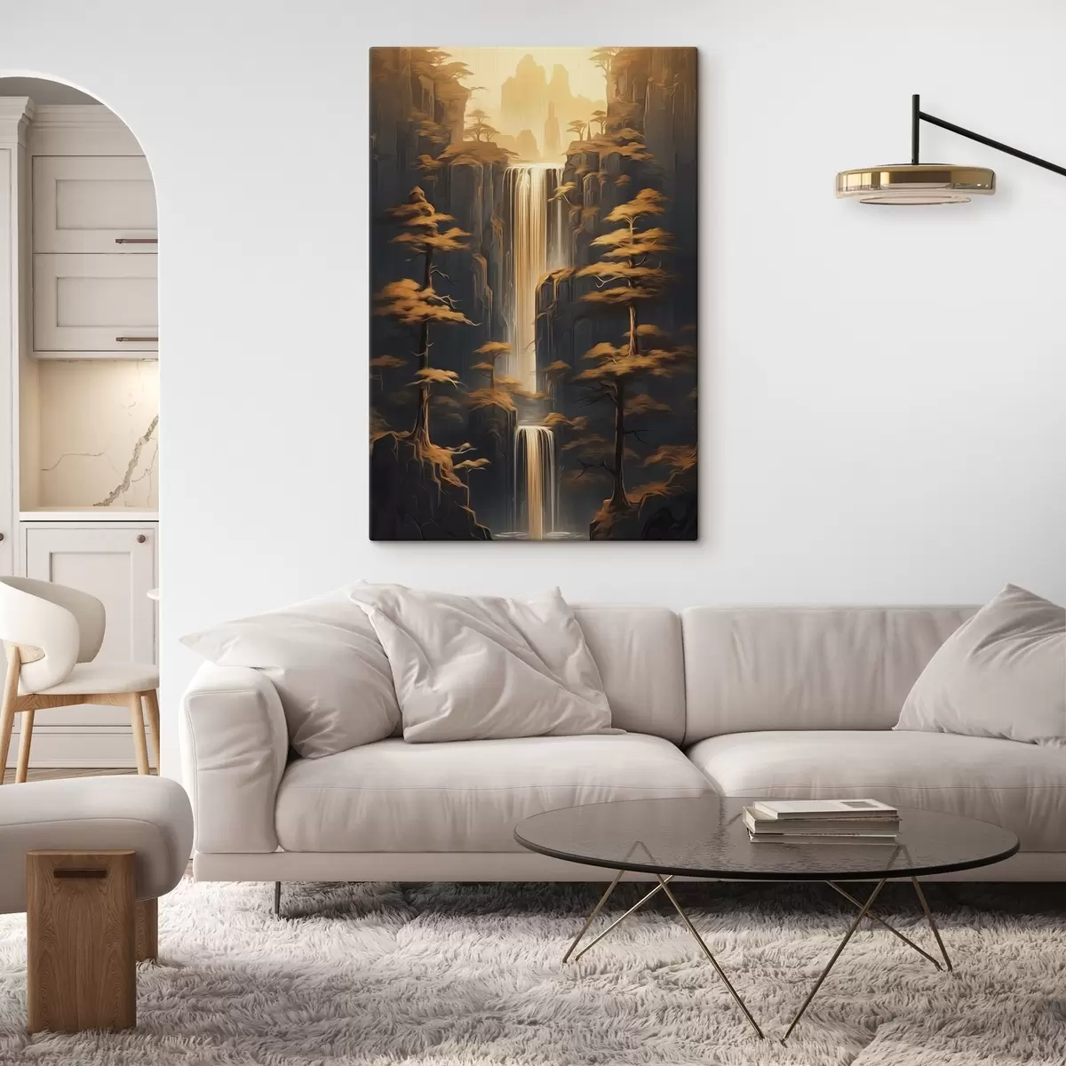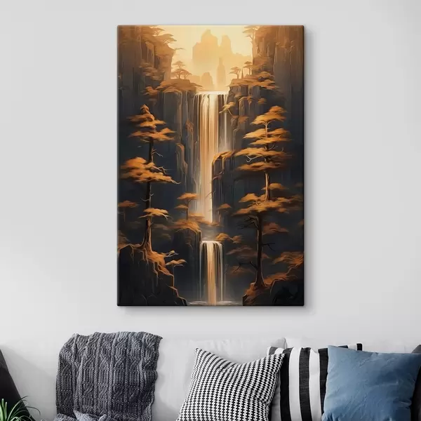 Wandbilder Hohe Klippen mit einem Wasserfall und Kiefern im Abendlicht s46151
