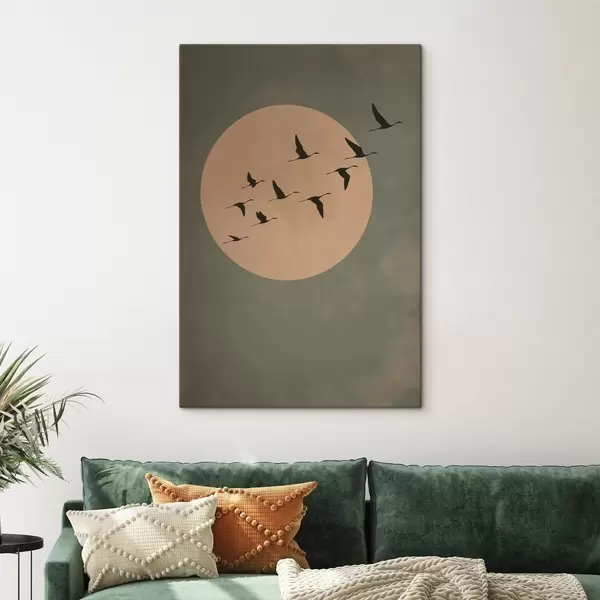 Wandbilder Ein Vogelschwarm fliegt vor einem großen, warmen Mond s46162