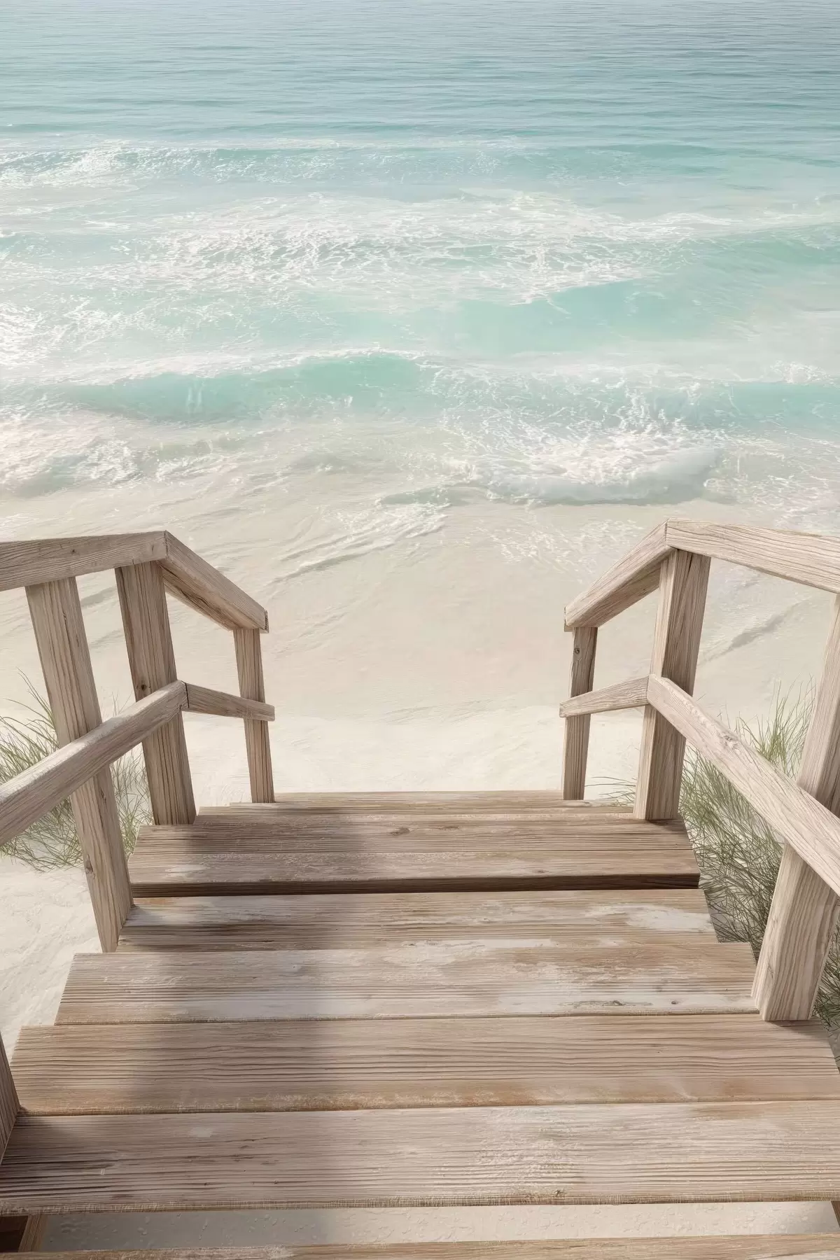 Wandbilder Holztreppe, die zu einem türkisfarbenen Strand führt s46163