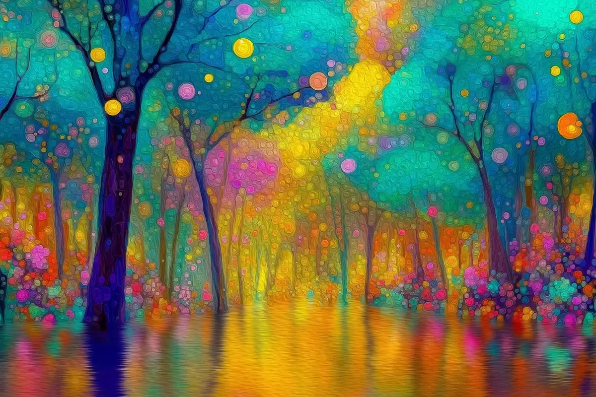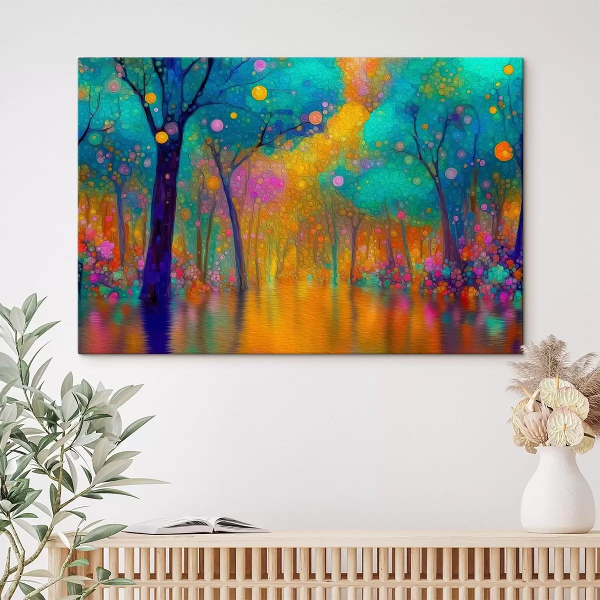 Wandbilder Lebendiger Fantasiewald mit Spiegelungen im Wasser Art. s46171