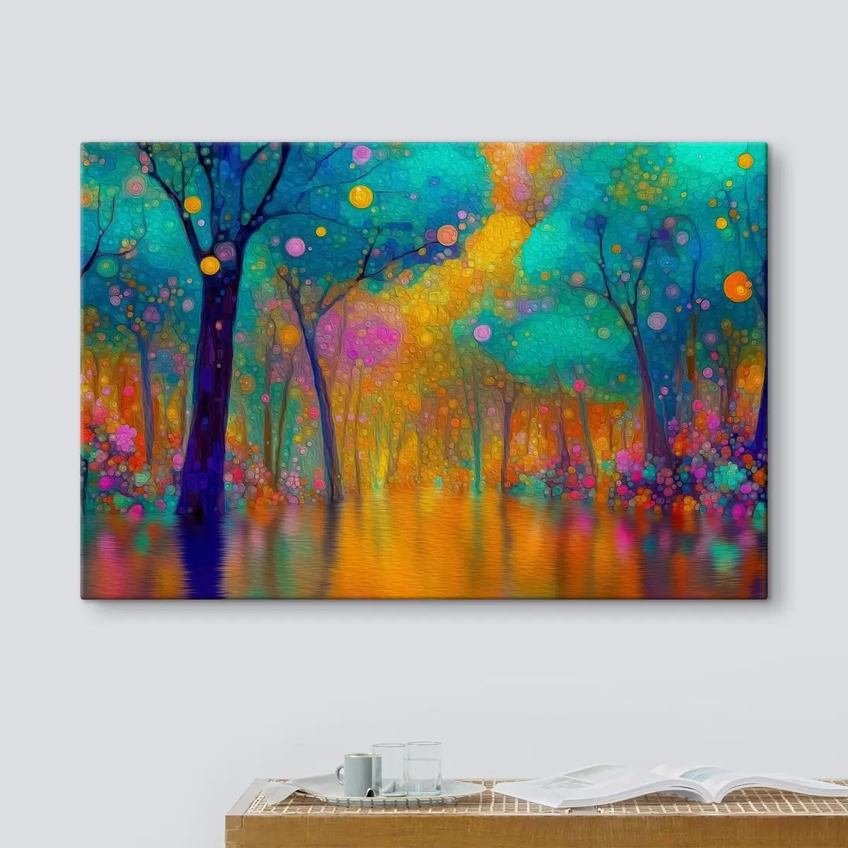 Wandbilder Lebendiger Fantasiewald mit Spiegelungen im Wasser s46171