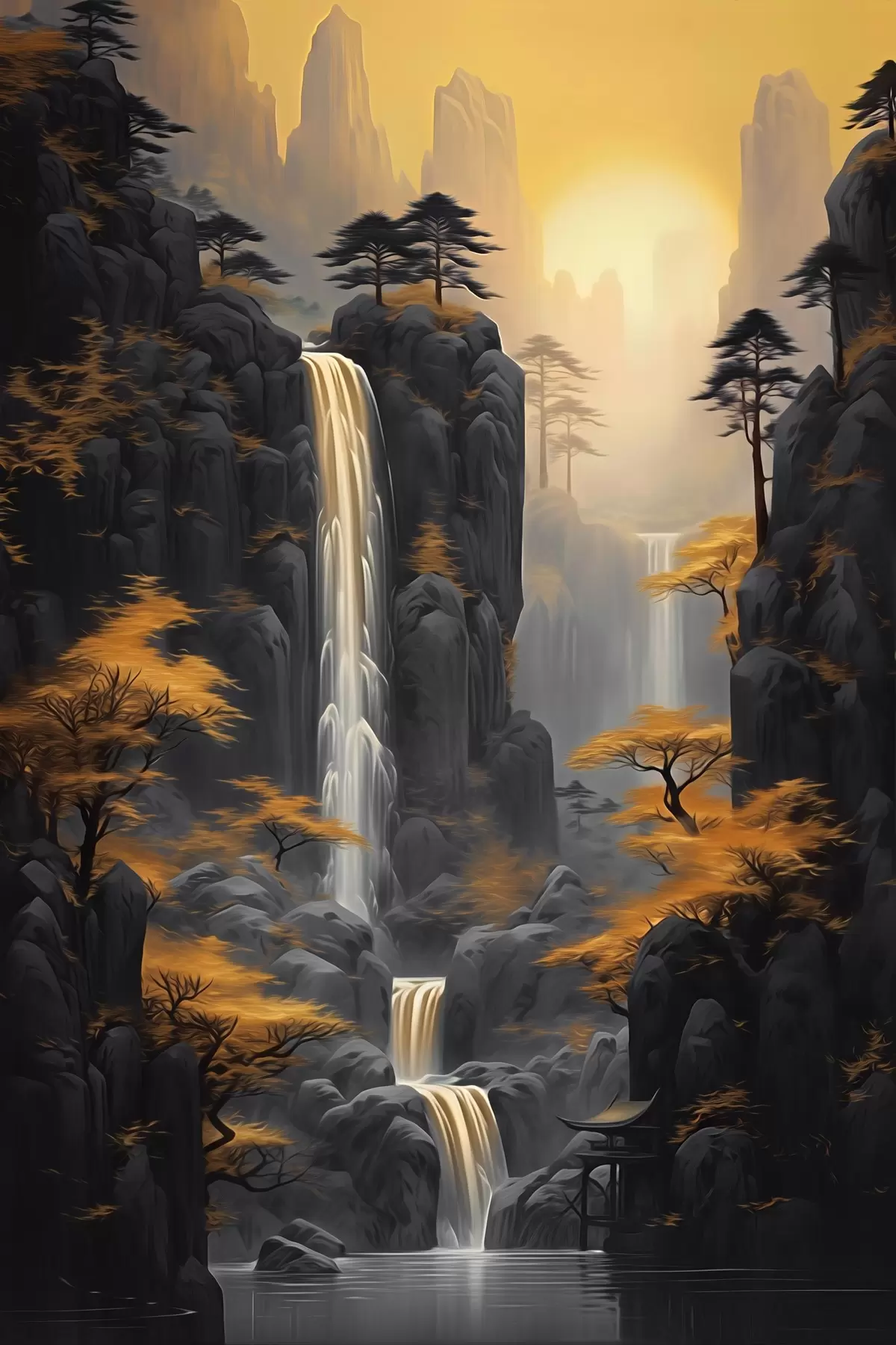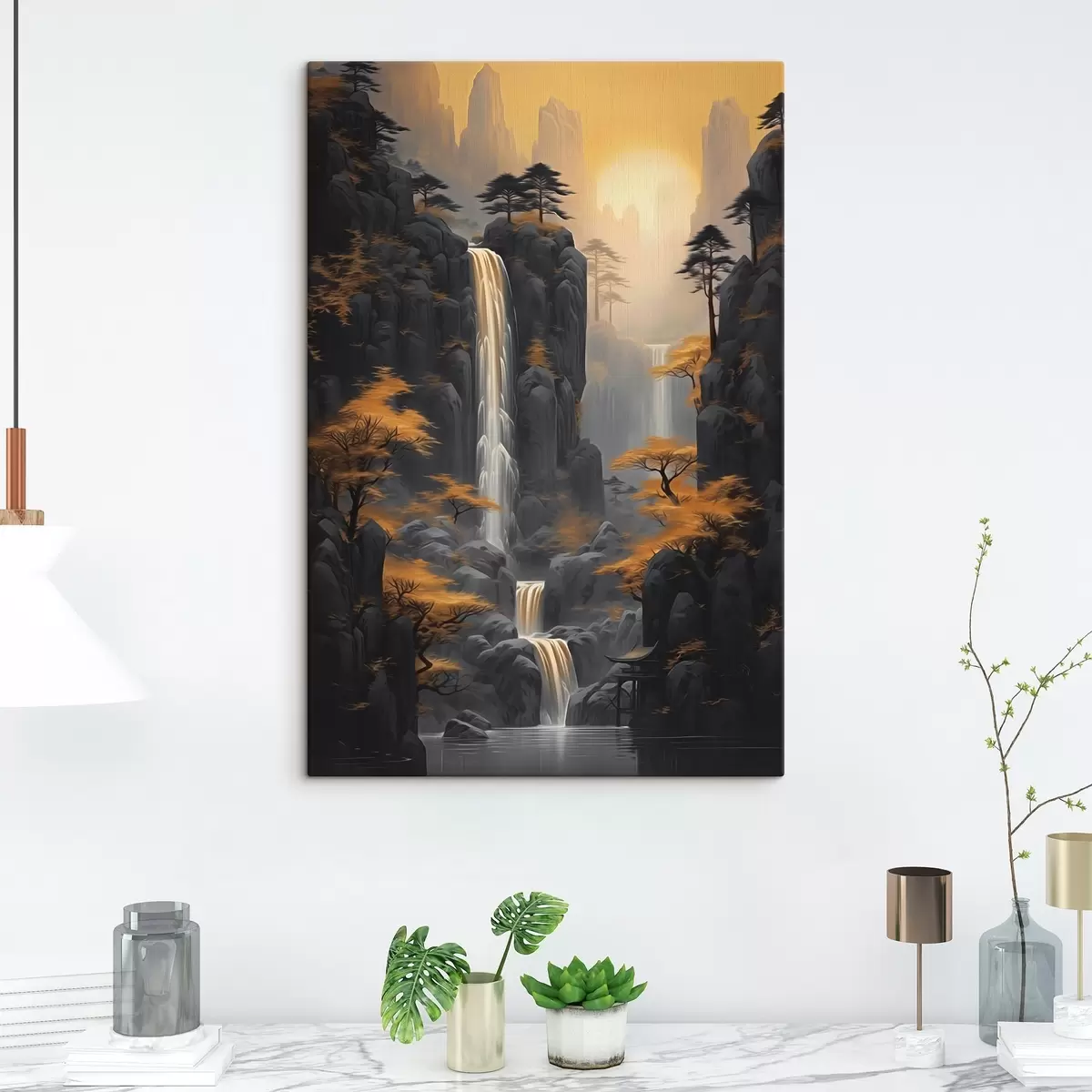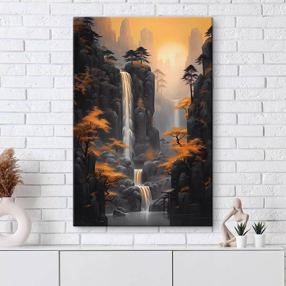 Wandbilder Felsige Landschaft mit einem Wasserfall in warmen Sonnenuntergangsfarben s46177