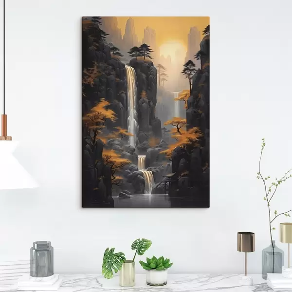 Wandbilder Felsige Landschaft mit einem Wasserfall in warmen Sonnenuntergangsfarben Art. s46177