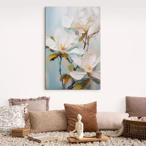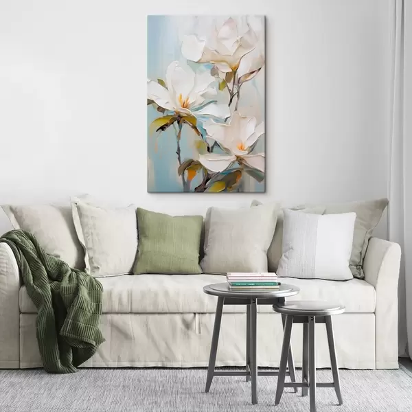 Wandbilder Weiße Magnolienblüten, hellblauer Hintergrund mit sanften Pinselstrichen, Ölgemälde-Stil, pastose Textur Art. s46276