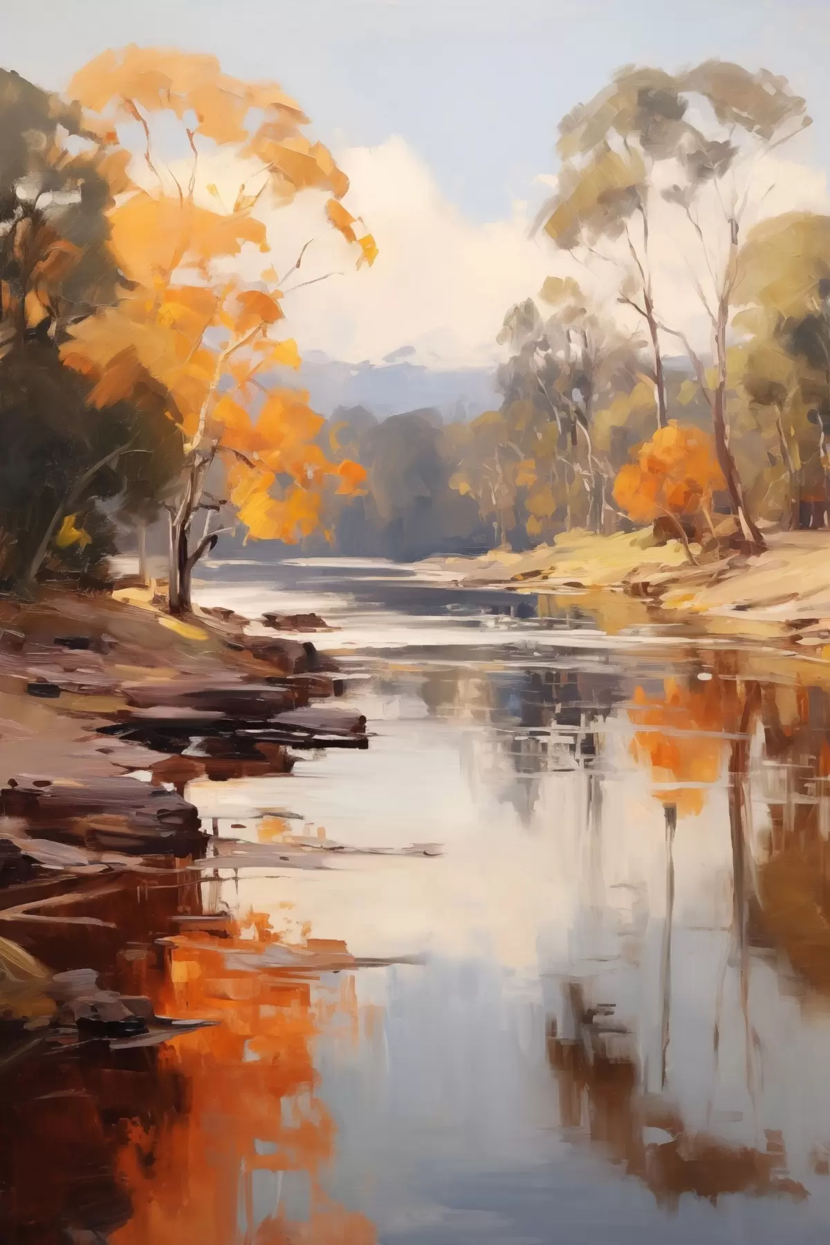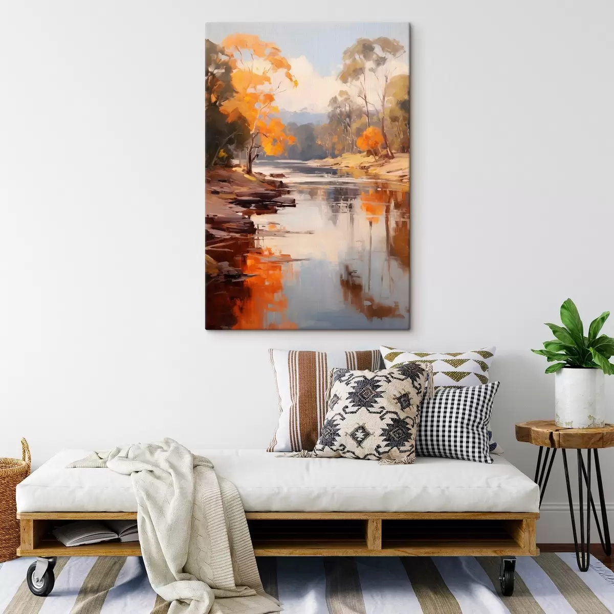 Wandbilder Herbstlandschaft, Fluss mit Bäumen am Ufer, Wald im Hintergrund, Spiegelungen auf dem Wasser Art. s46280