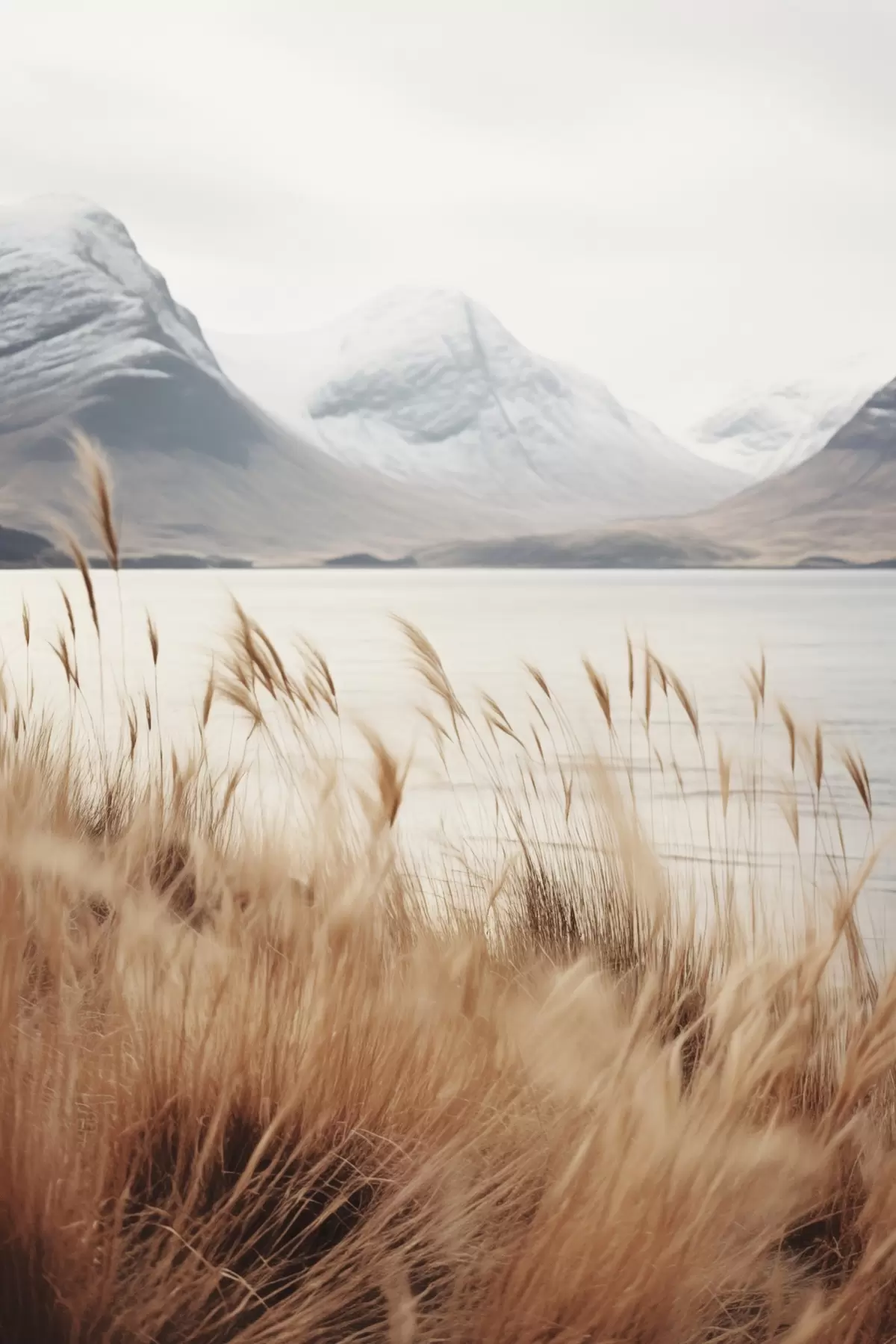 Wandbilder Pampasgrasfeld vor einer Seenlandschaft mit schneebedeckten Bergen im Hintergrund, weiches Licht Art. s46282