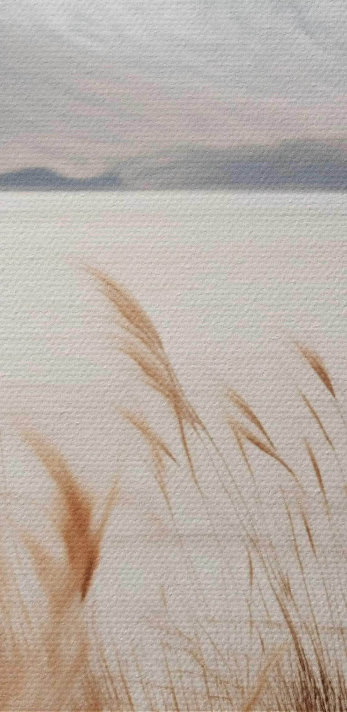 Wandbilder Pampasgrasfeld vor einer Seenlandschaft mit schneebedeckten Bergen im Hintergrund, weiches Licht s46282