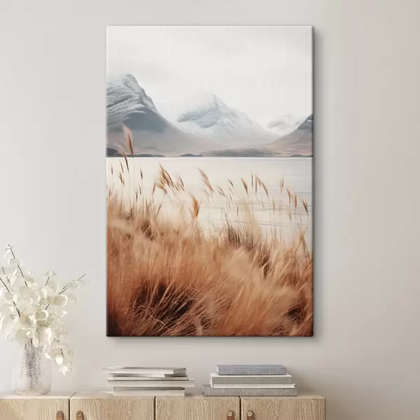 Wandbilder Pampasgrasfeld vor einer Seenlandschaft mit schneebedeckten Bergen im Hintergrund, weiches Licht Art. s46282