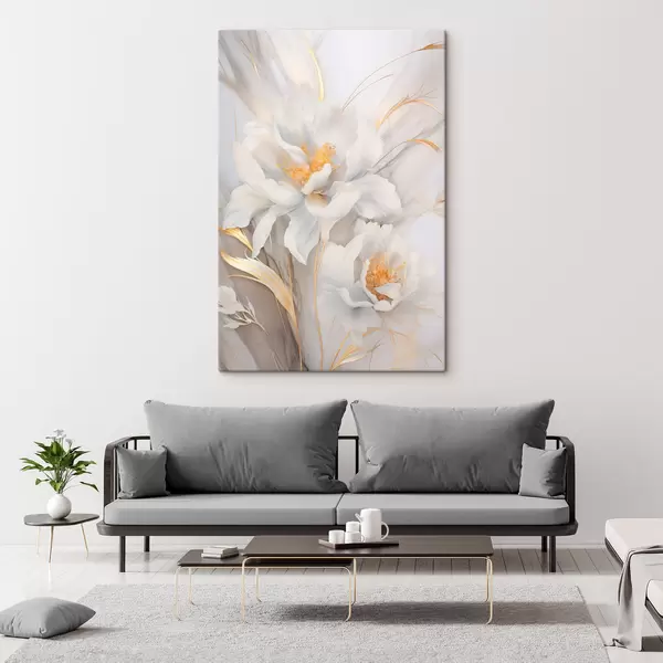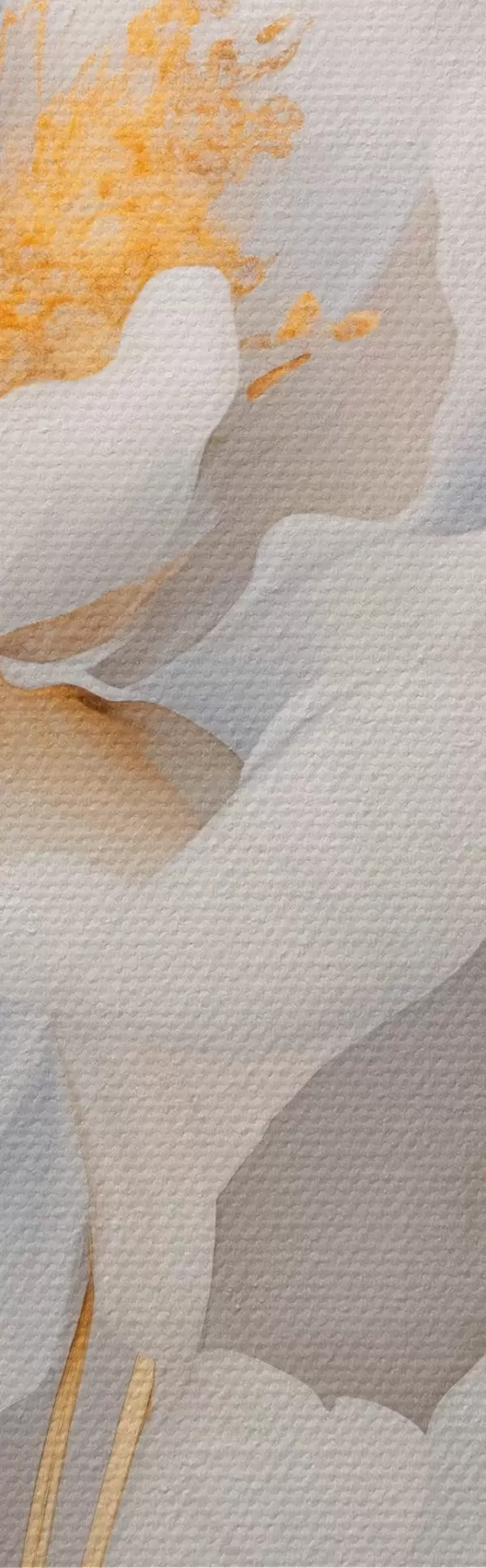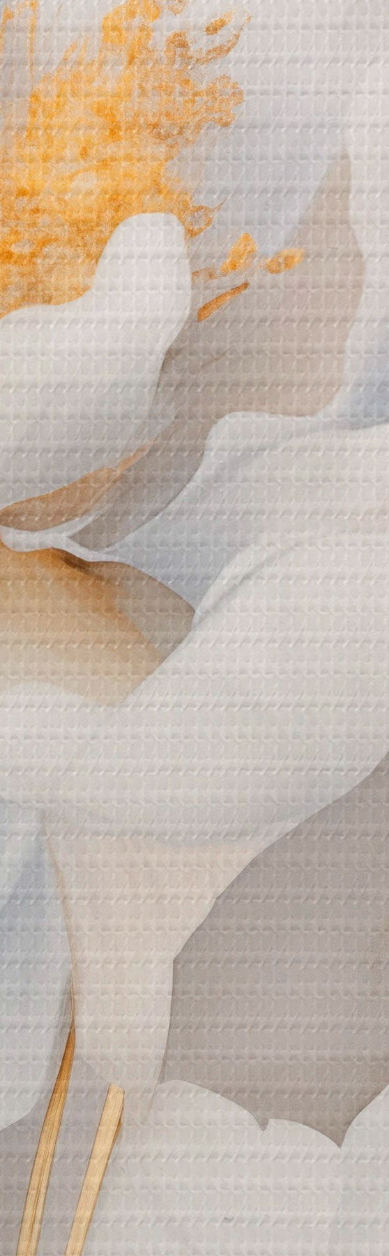 Wandbilder Weiße Blüten mit gelben Stempeln und Stielen, zarte Blütenblätter, elegante Komposition, neutraler Hintergrund Art. s46293