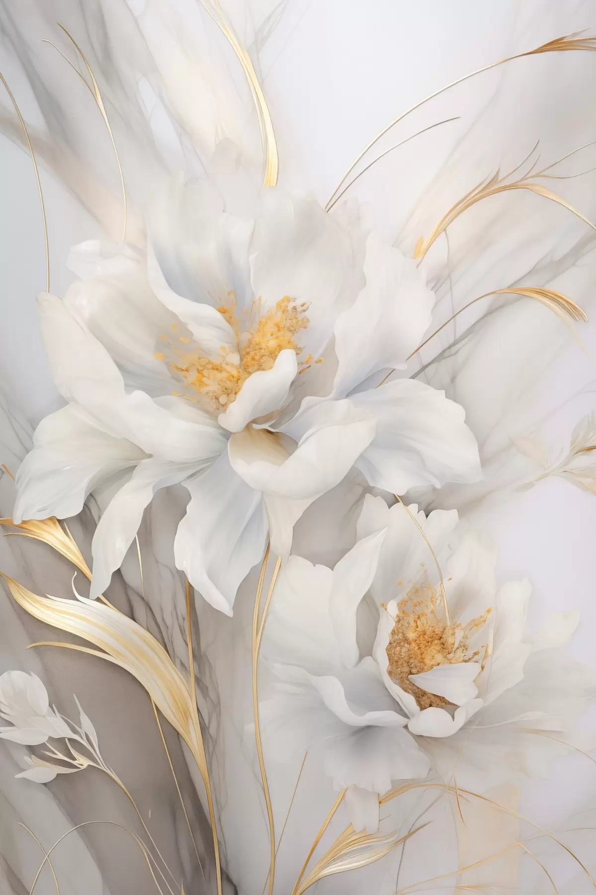 Wandbilder Weiße Blüten mit gelben Stempeln und Stielen, zarte Blütenblätter, elegante Komposition, neutraler Hintergrund s46293