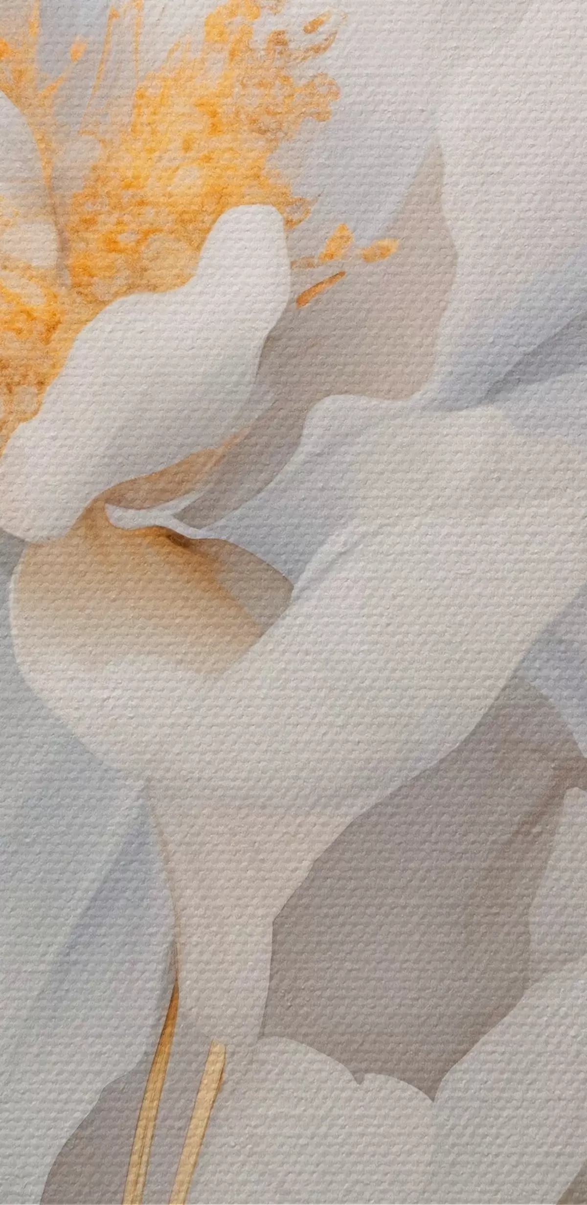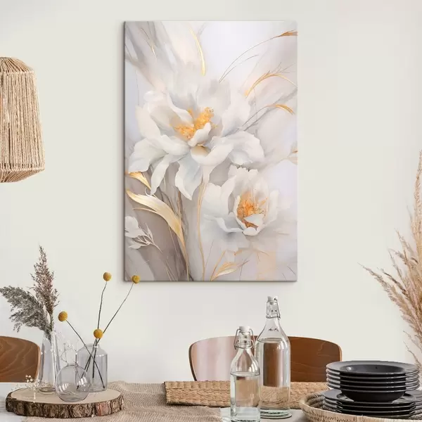 Wandbilder Weiße Blüten mit gelben Stempeln und Stielen, zarte Blütenblätter, elegante Komposition, neutraler Hintergrund Art. s46293