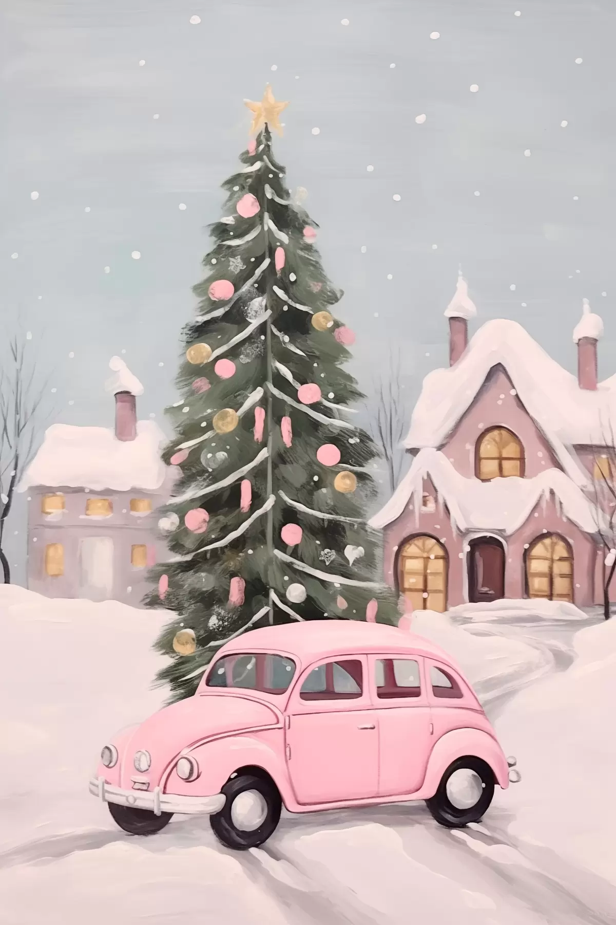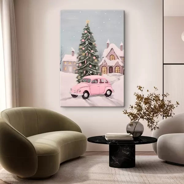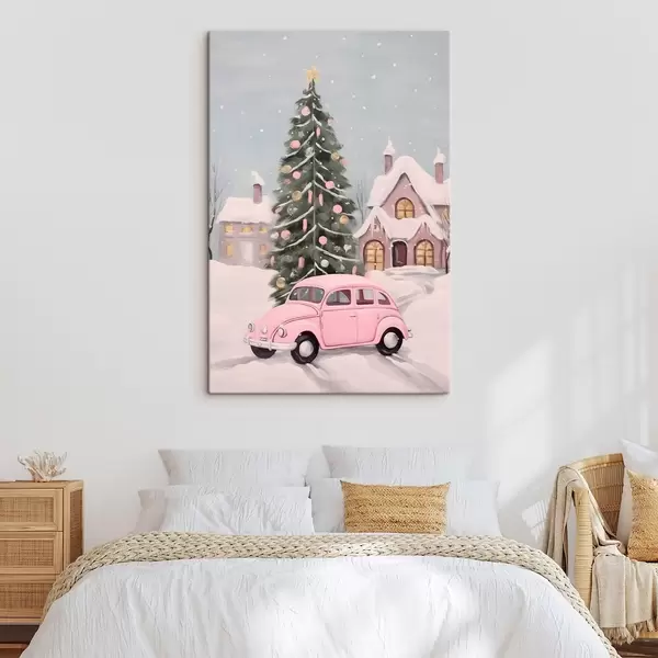 Wandbilder Rosa Auto und geschmückter Weihnachtsbaum vor dem Haus Art. s46621