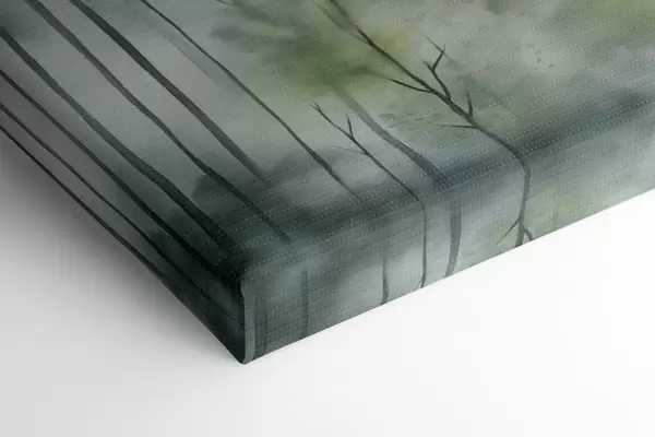 Wandbilder Aquarellmalerei, die einen nebligen Wald mit hohen Kiefern und Bergen im Hintergrund darstellt Art. s46690