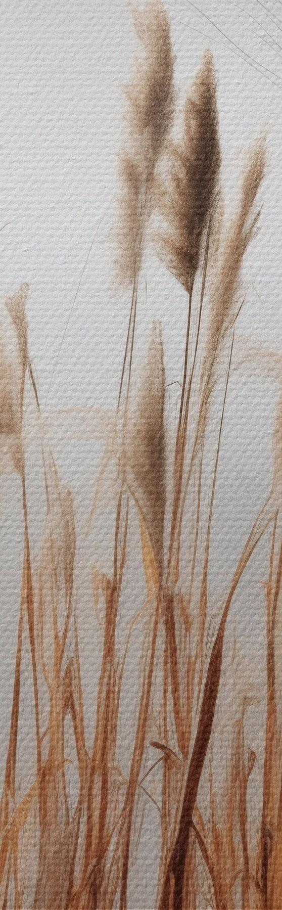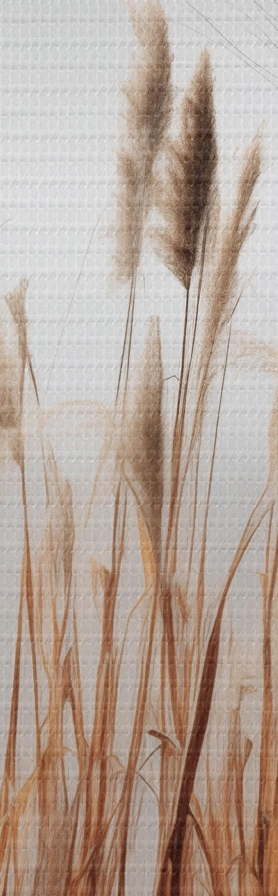 Wandbilder Hohe Schilfpflanzen wachsen in einem Gewässer, das Wasser spiegelt die Schilfpflanzen wider, nebliger Hintergrund, sanftes Licht, Naturszene Art. s46696