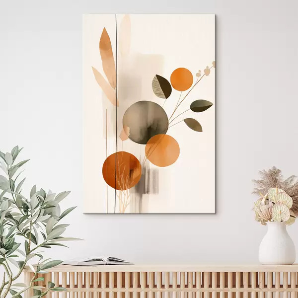Wandbilder Abstrakte Malerei-Imitation mit orangefarbenen und grauen Kreisen, Blättern und Zweigen, moderner Stil, Aquarelleffekt Art. s46697