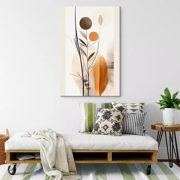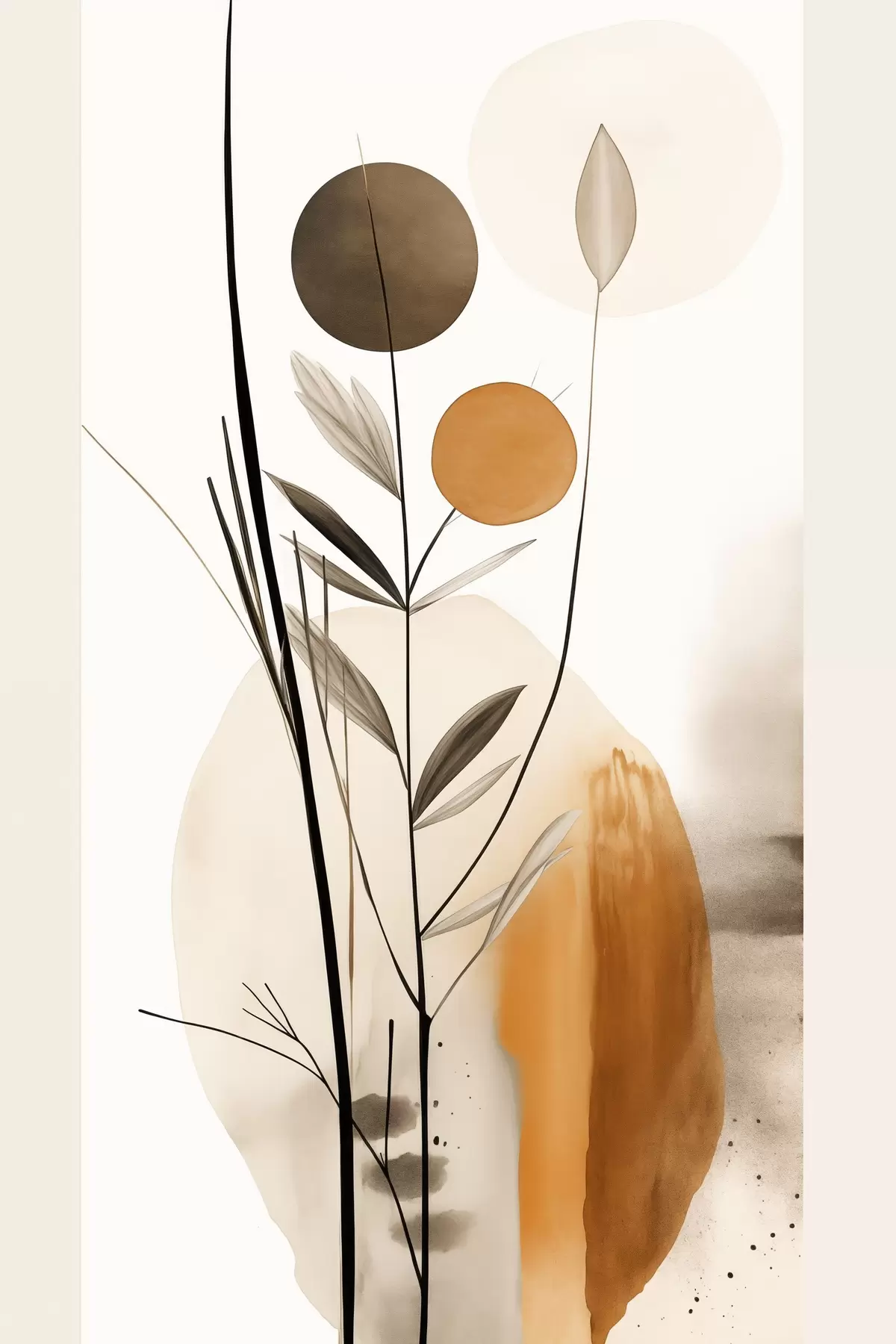 Wandbilder Abstrakte Malerei-Imitation mit orangefarbenen und grauen Kreisen, Blättern und Zweigen, moderner Stil, Aquarelleffekt Art. s46698