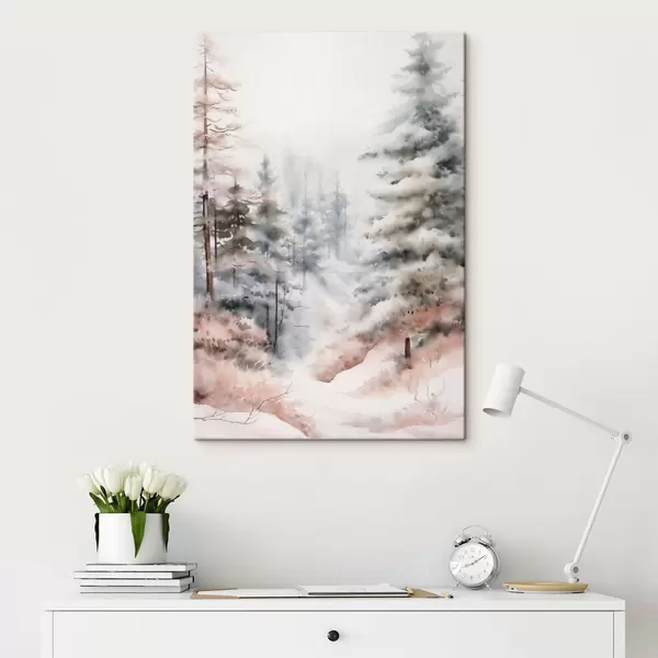 Wandbilder Hohe, schneebedeckte Kiefern stehen in einem nebligen Wald, eine sanfte, gedämpfte Winterszene. Art. s46702