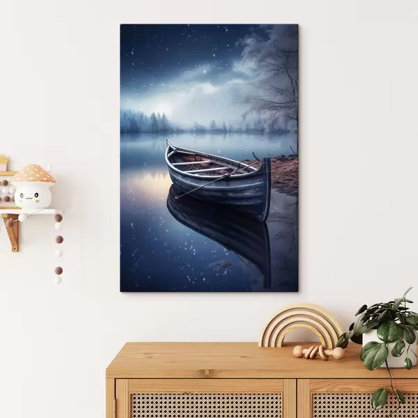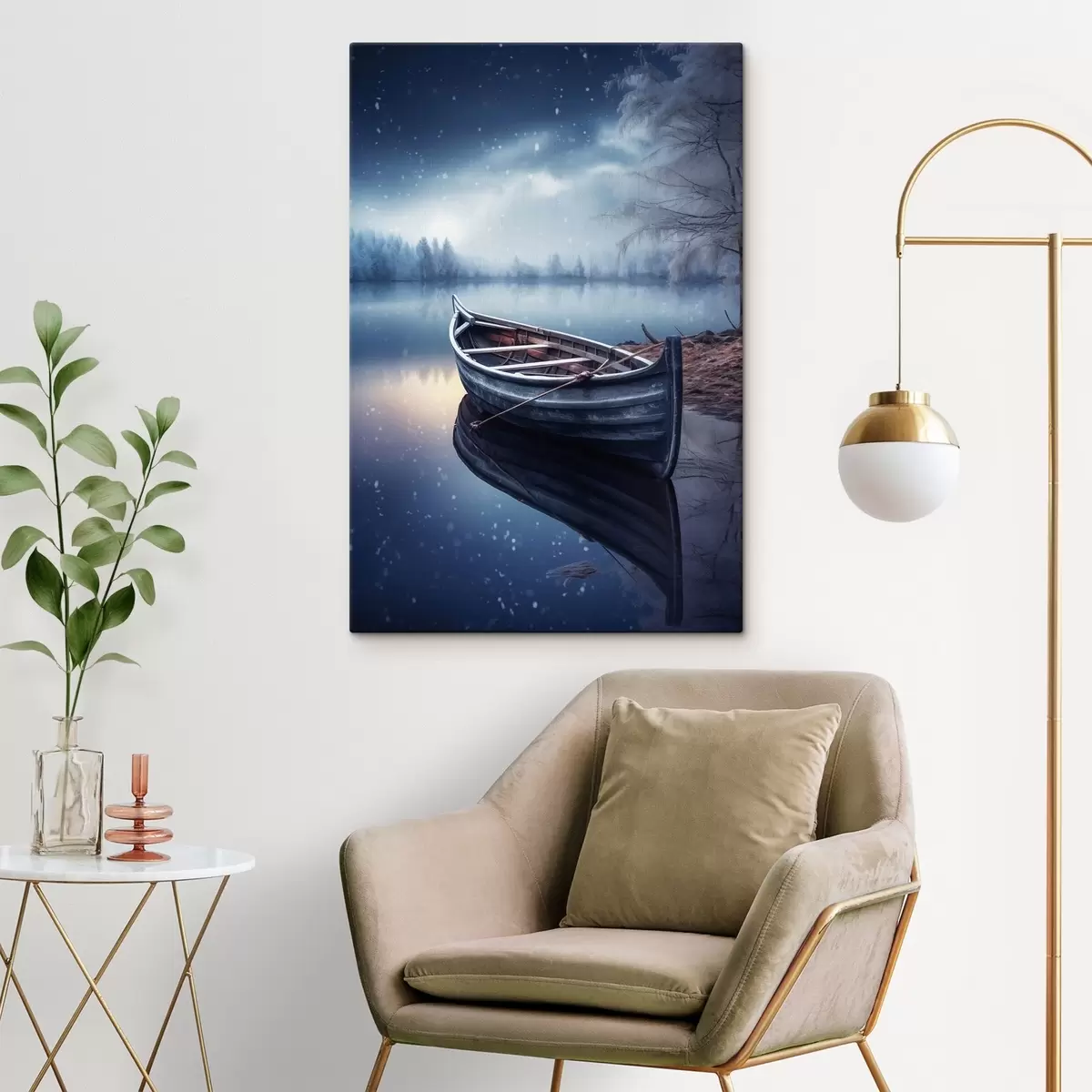 Wandbilder Leeres Boot an einem winterlichen See s46773