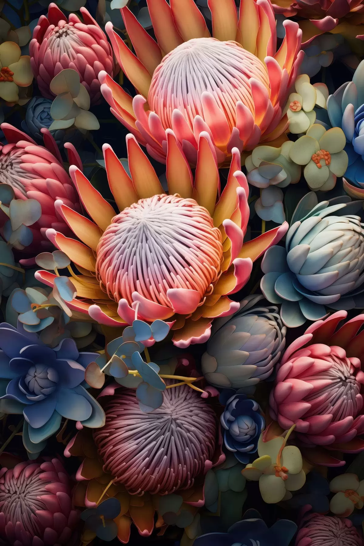 Wandbilder Komposition aus Proteas, Eukalyptus und Sukkulenten in einem fotorealistischen digitalen Kunststil s46925