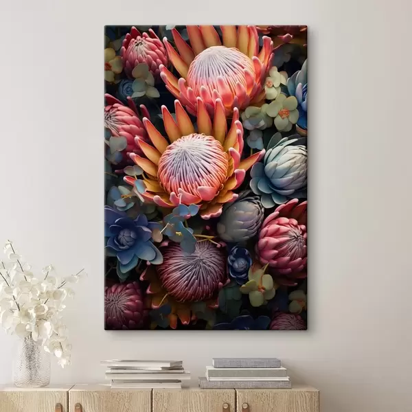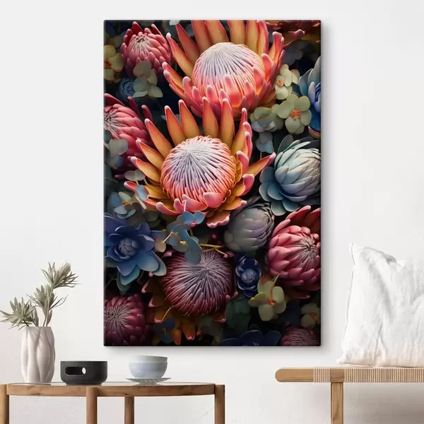 Wandbilder Komposition aus Proteas, Eukalyptus und Sukkulenten in einem fotorealistischen digitalen Kunststil Art. s46925