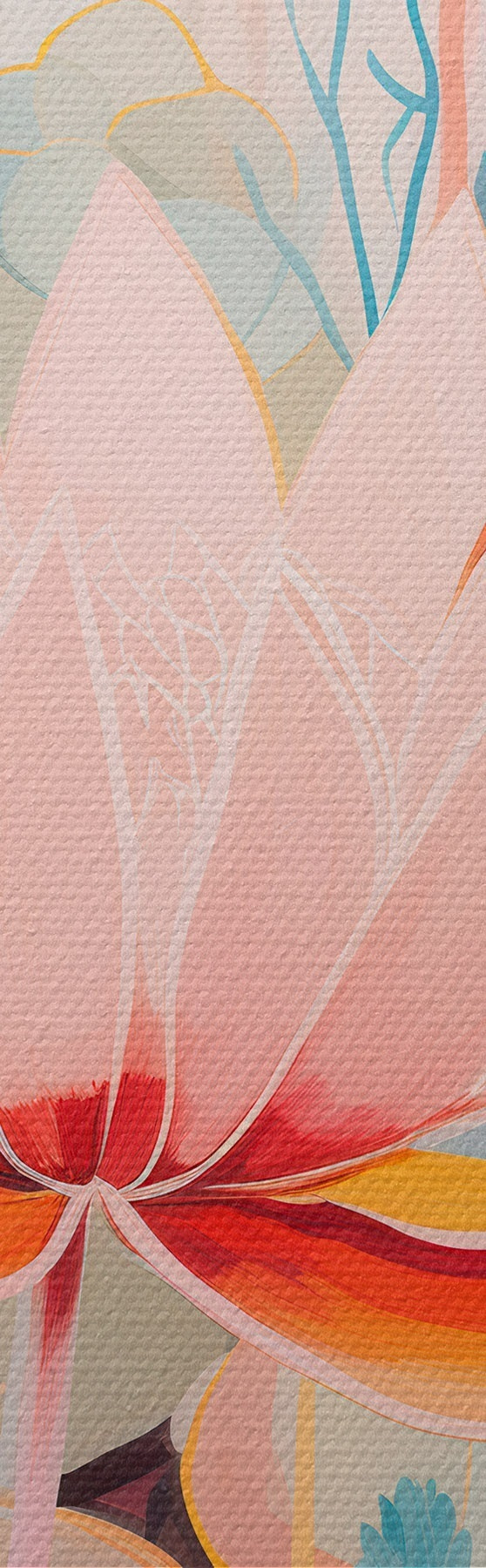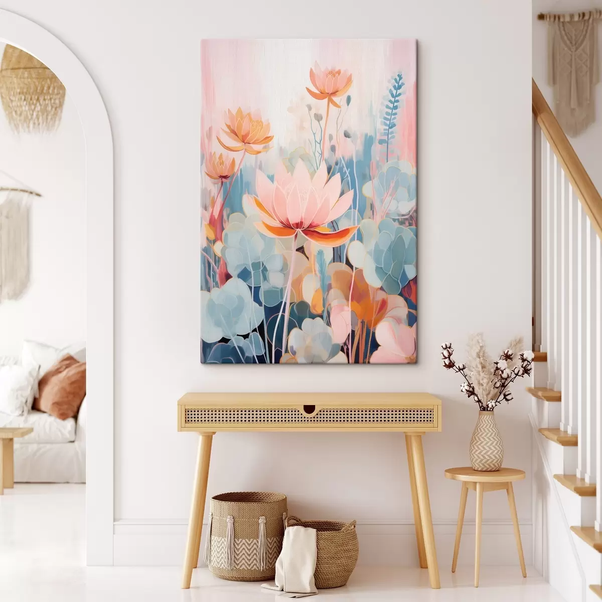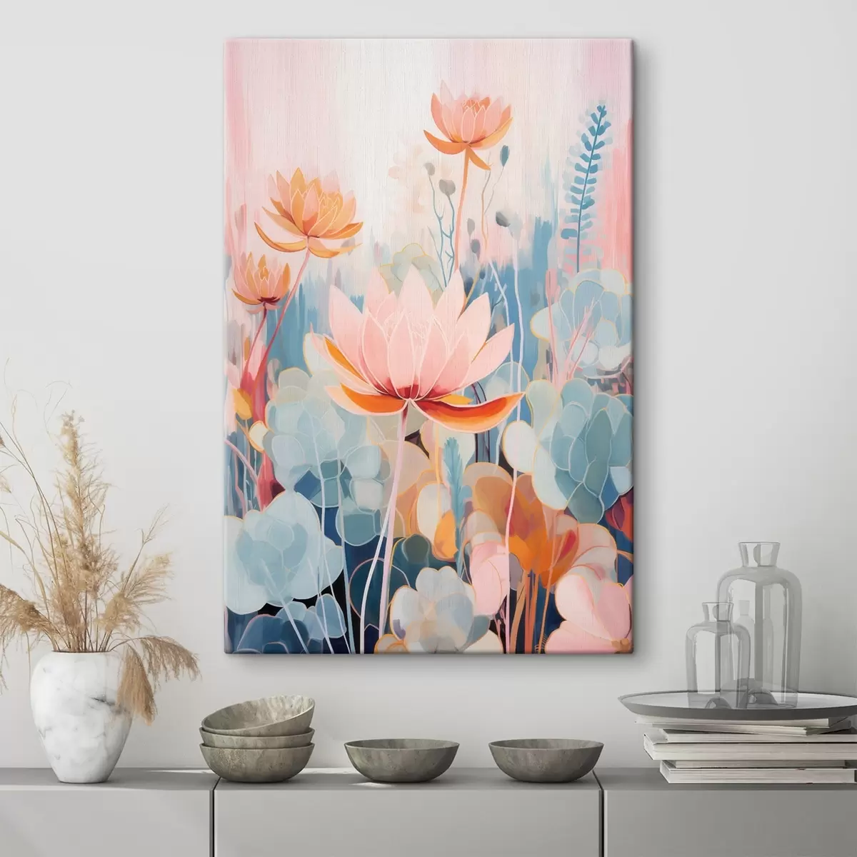 Wandbilder Lotusblumen und dekoratives Laub in einer rosa-blauen Farbpalette Art. s46929