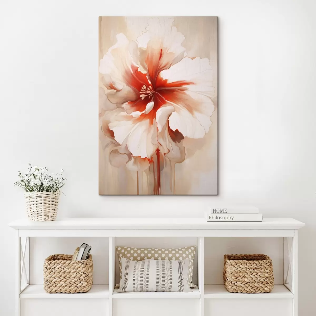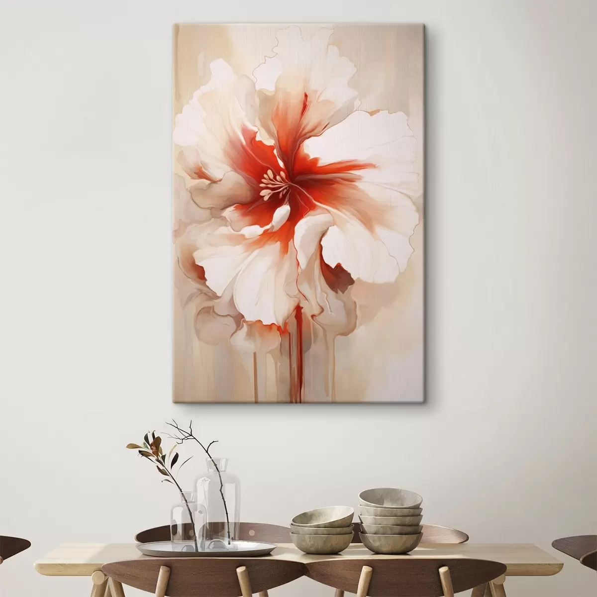 Wandbilder Nahaufnahme einer weiß-roten Blume mit halbtransparenten Blütenblättern und fließenden Farbtropfen Art. s46941