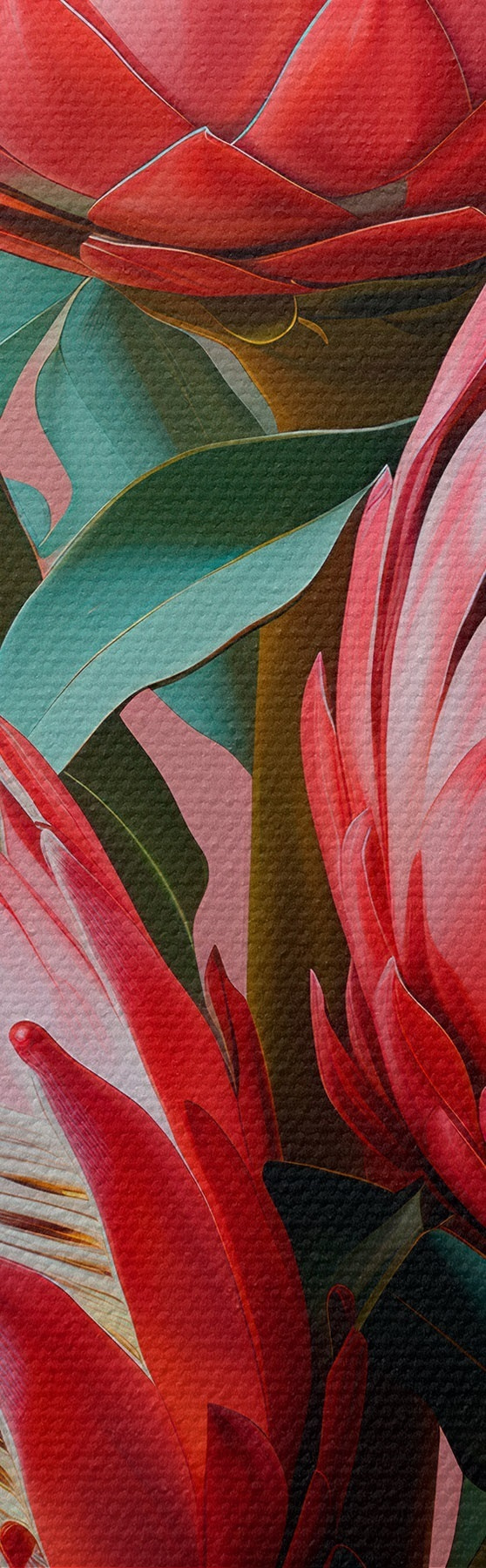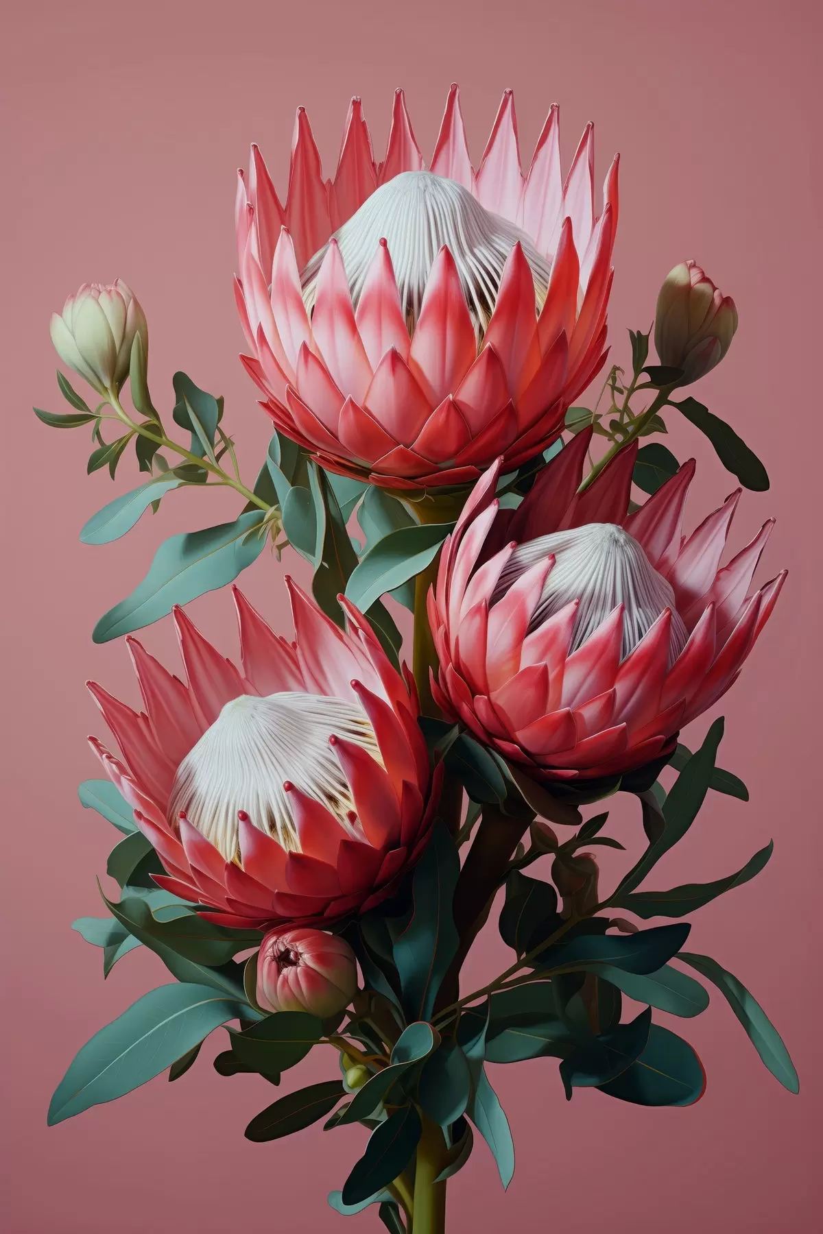 Wandbilder Protea-Strauß mit roten Blütenblättern und grünem Laub auf rosa Hintergrund s46946
