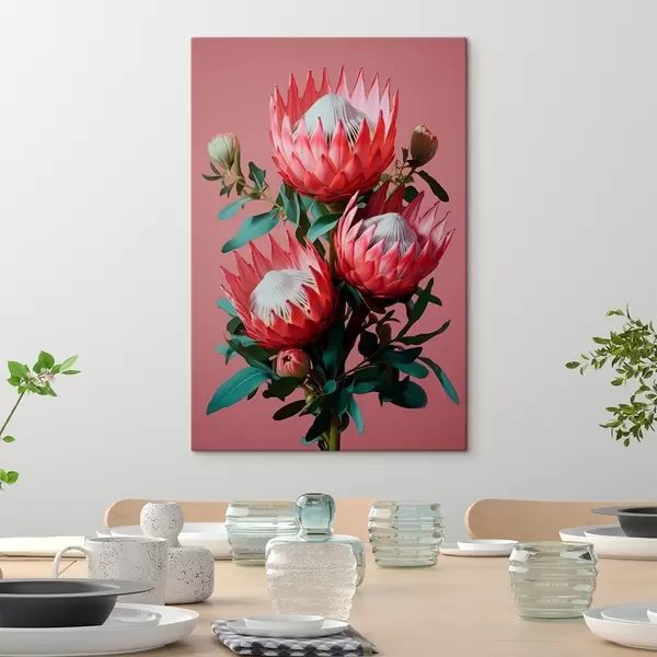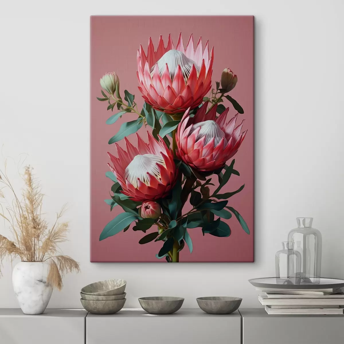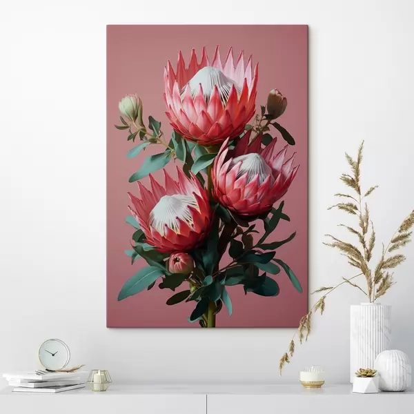 Wandbilder Protea-Strauß mit roten Blütenblättern und grünem Laub auf rosa Hintergrund Art. s46946