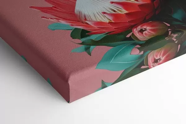 Wandbilder Protea-Strauß mit roten Blütenblättern und grünem Laub auf rosa Hintergrund Art. s46946
