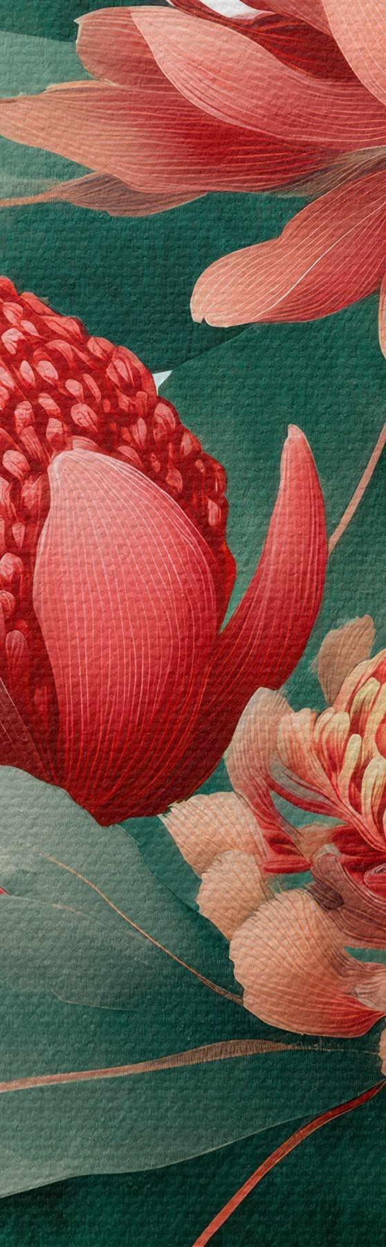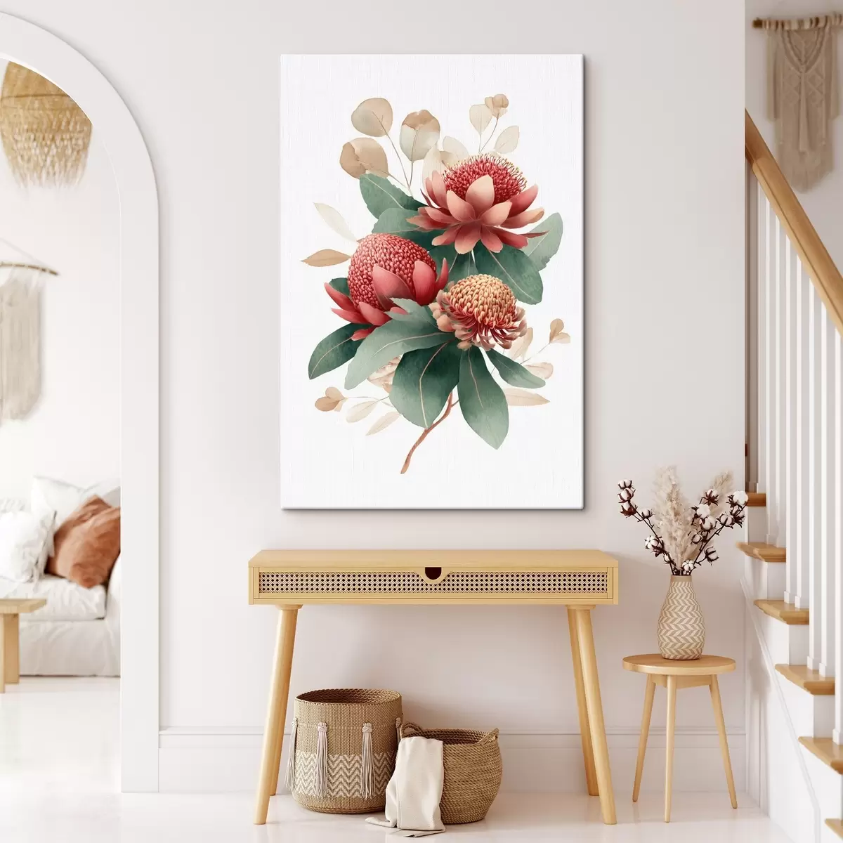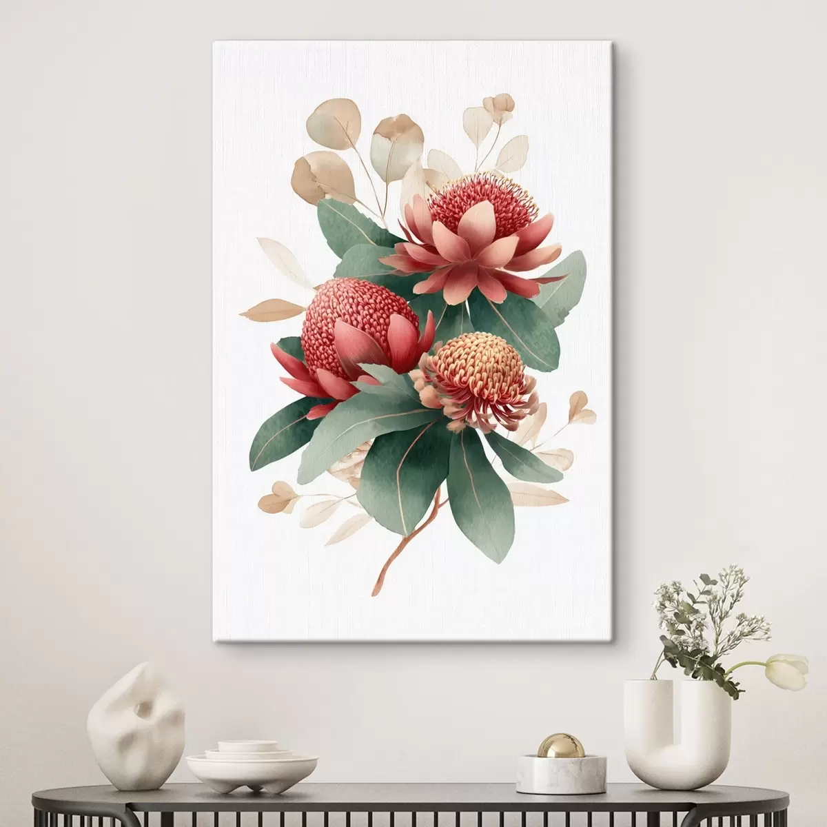 Wandbilder Blumenkomposition mit großen Proteas und Eukalyptus im modernen Stil digitaler Malerei s46955