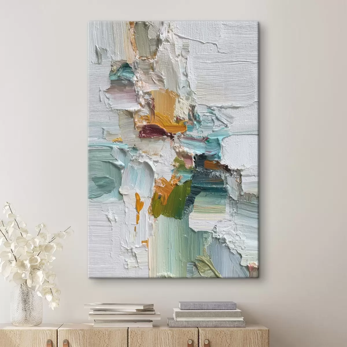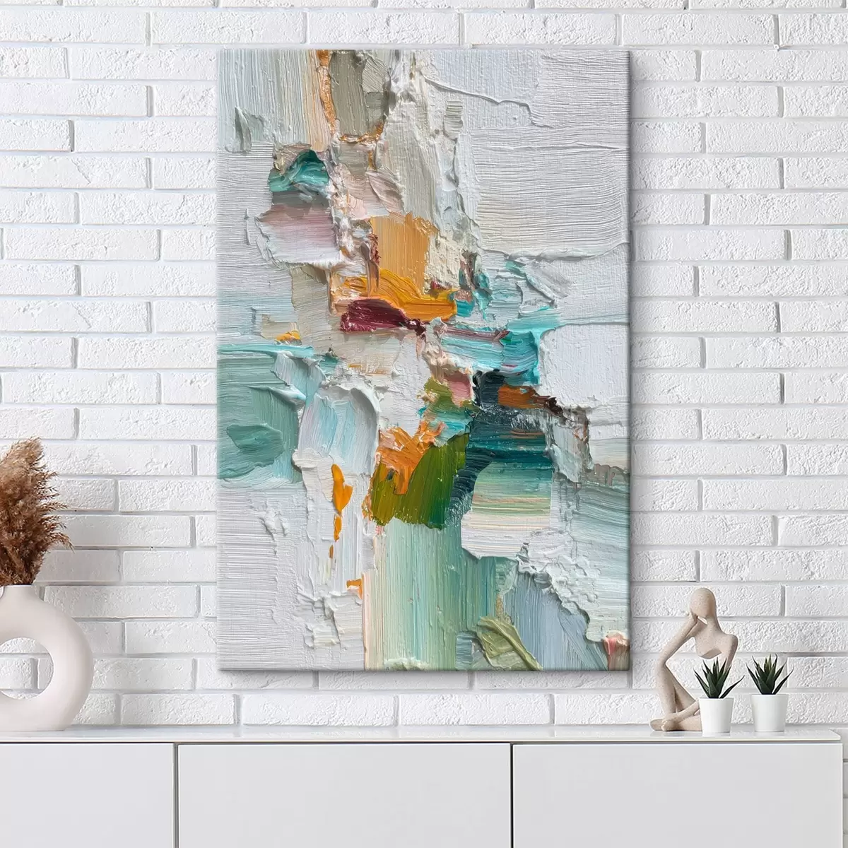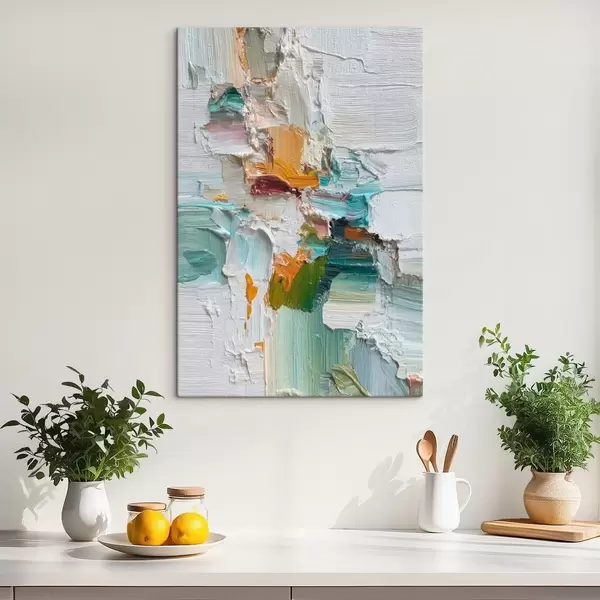 Wandbilder Komposition mit türkisfarbenen und orangefarbenen Akzenten im Stil der Ölmalerei s46958
