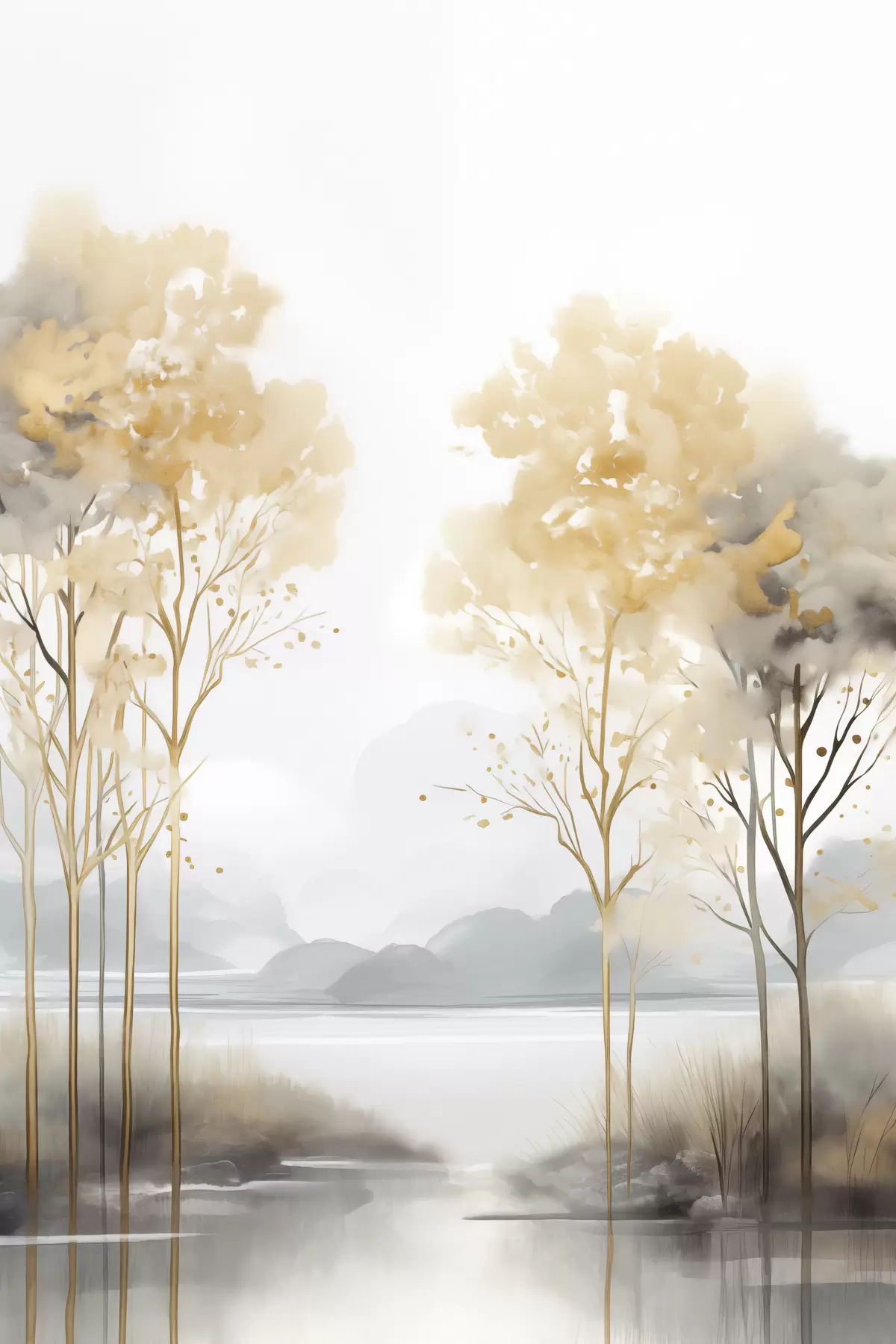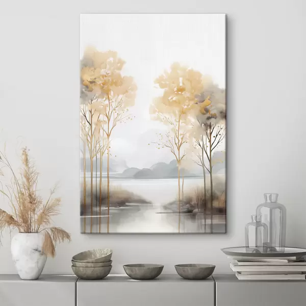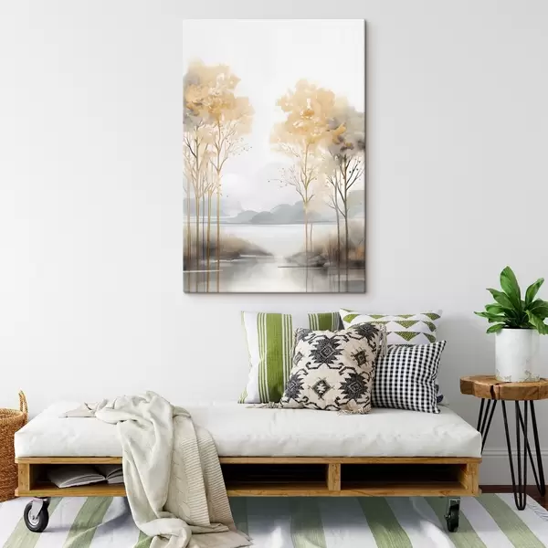 Wandbilder Dekorative abstrakte Landschaft, hohe Bäume mit gelben Blättern, ein Fluss und Nebel im Hintergrund Art. s47015