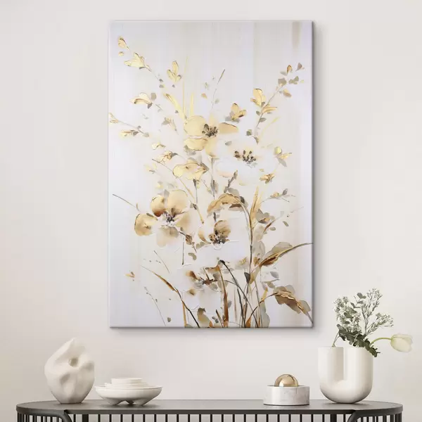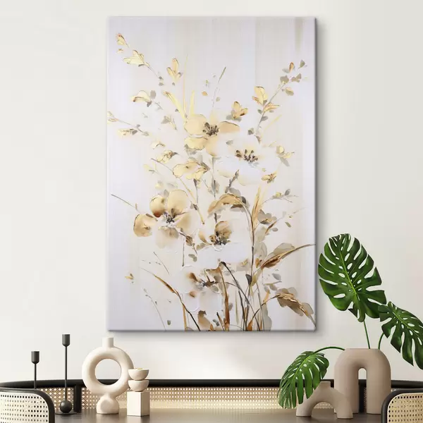 Wandbilder Strukturierte gelbe Blüten und Blätter vor weißem Hintergrund, mit zarten Pinselstrichen Art. s47017