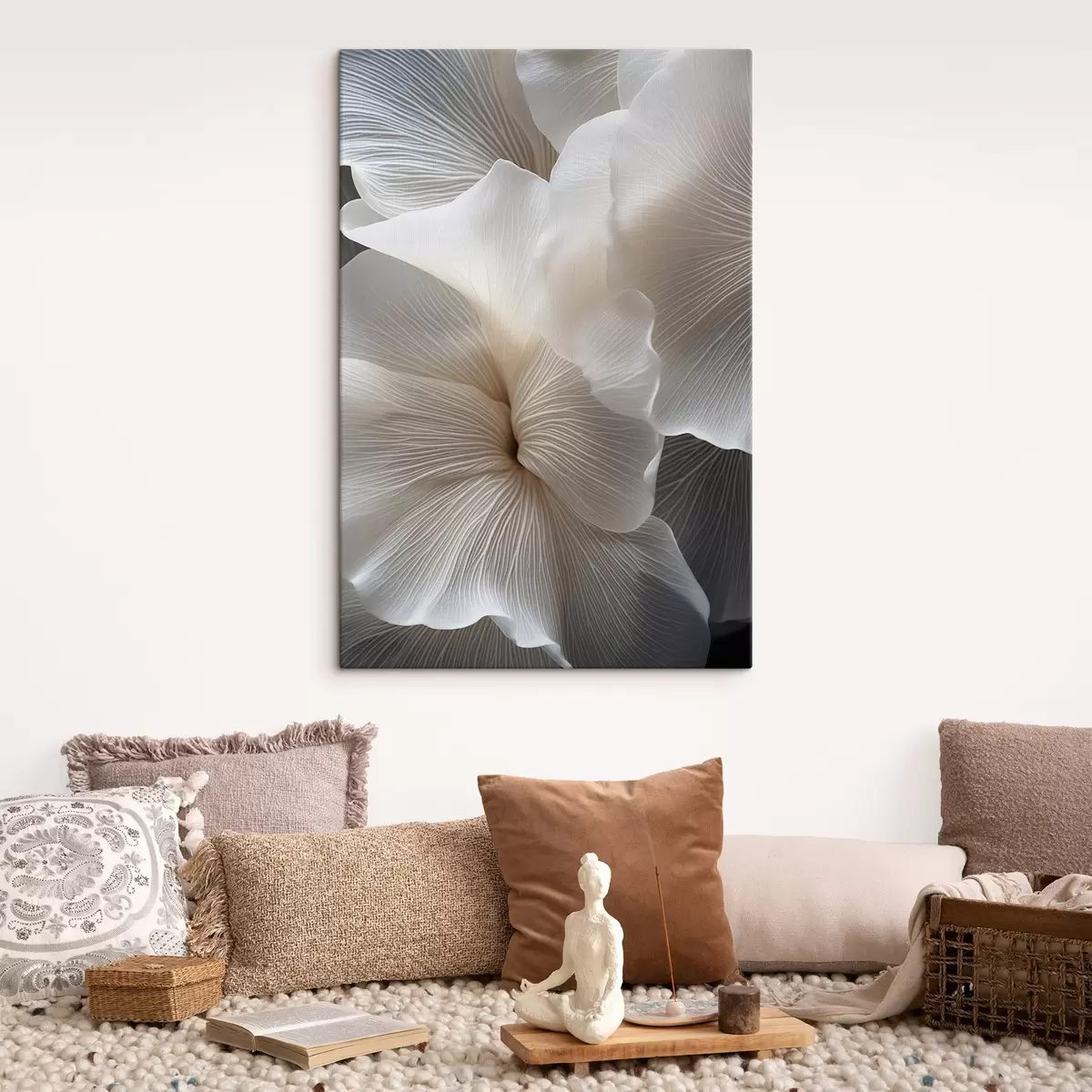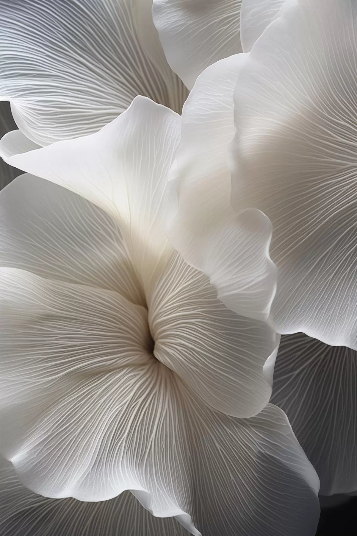 Wandbilder Nahaufnahme von zarten, abstrakten weißen Blütenblättern mit filigranen Linien und einem verschwommenen dunklen Hintergrund Art. s47019