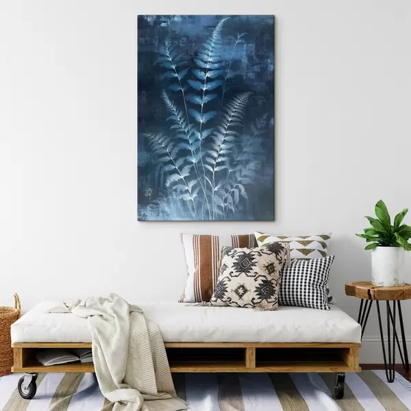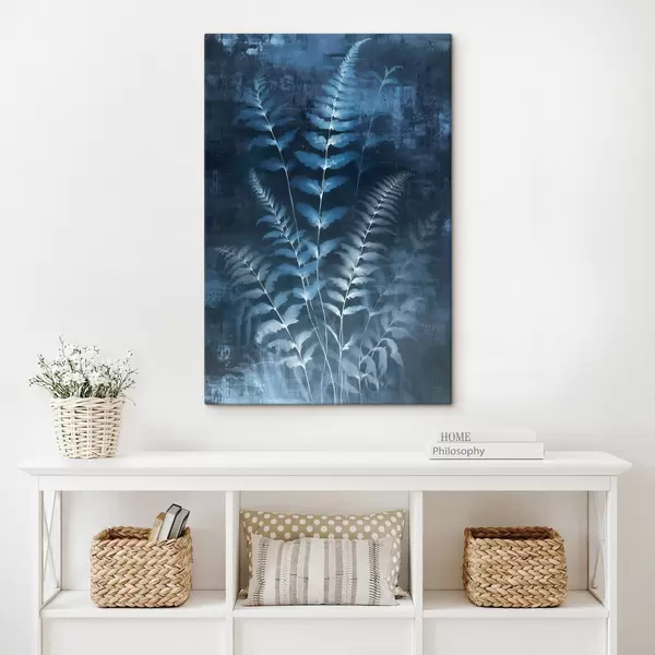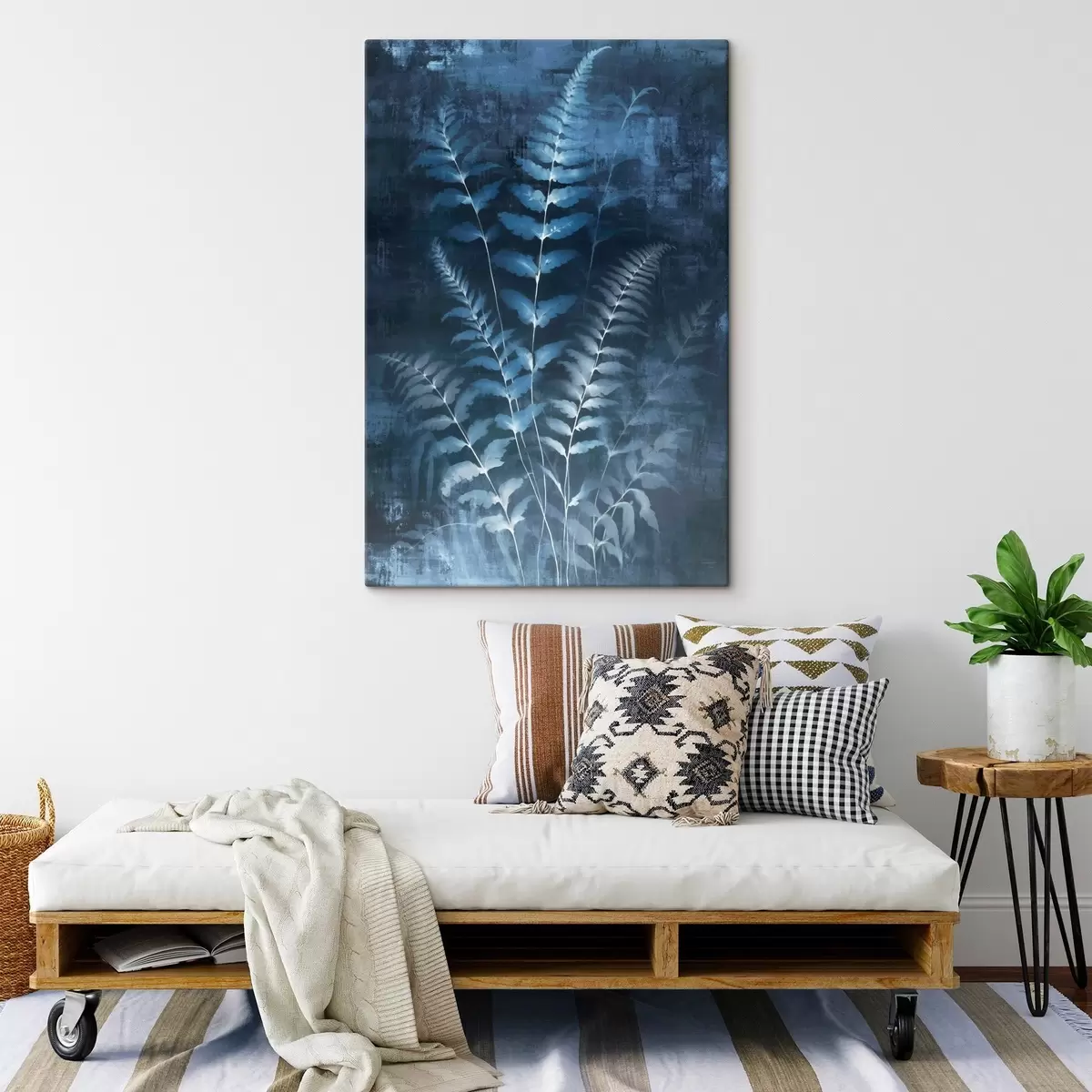 Wandbilder Blaue Farne und Pflanzen vor einem dunklen, strukturierten Hintergrund, mit Fokus auf den komplexen Details, Röntgeneffekt Art. s47027