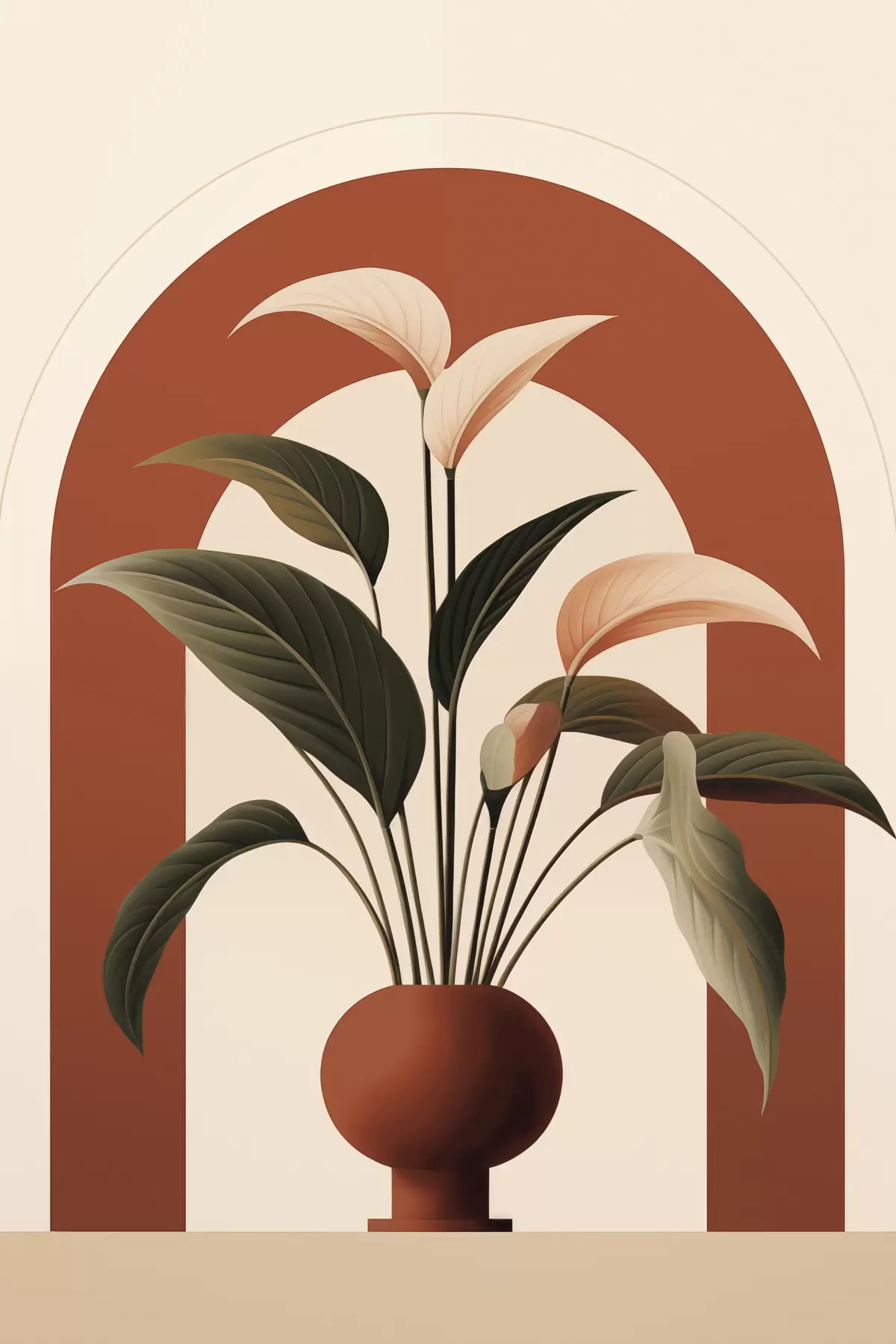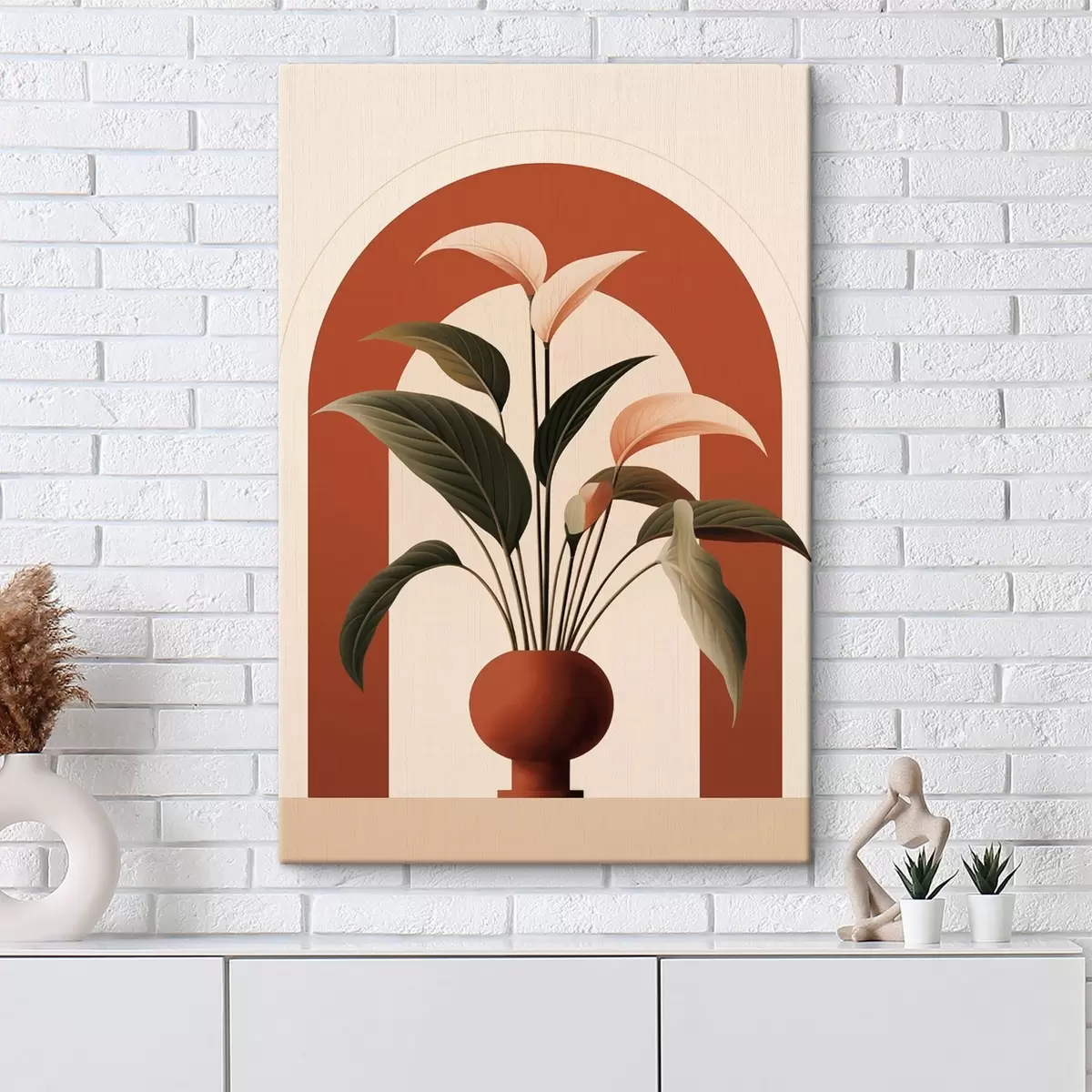 Wandbilder Abstrakte Topfpflanze mit großen grünen und beigen Blättern vor einem cremefarbenen Torbogen mit Terrakotta-Akzenten s47032