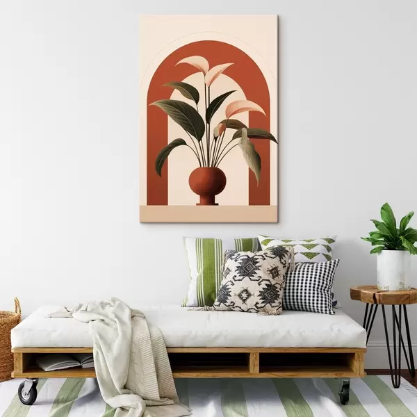 Wandbilder Abstrakte Topfpflanze mit großen grünen und beigen Blättern vor einem cremefarbenen Torbogen mit Terrakotta-Akzenten Art. s47032