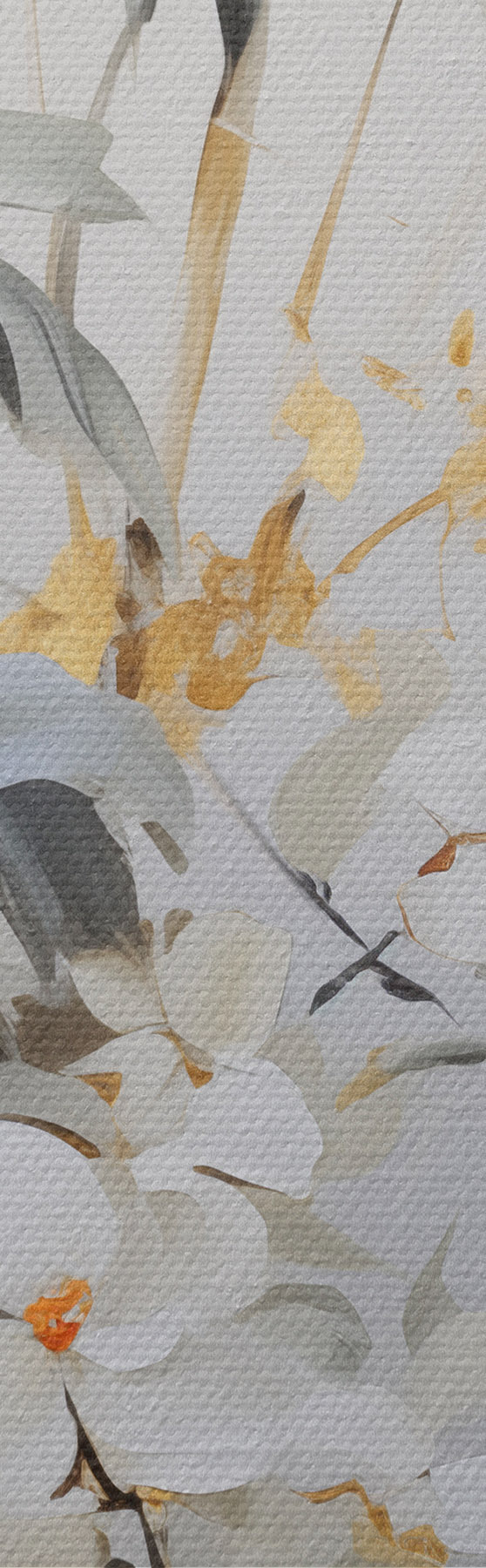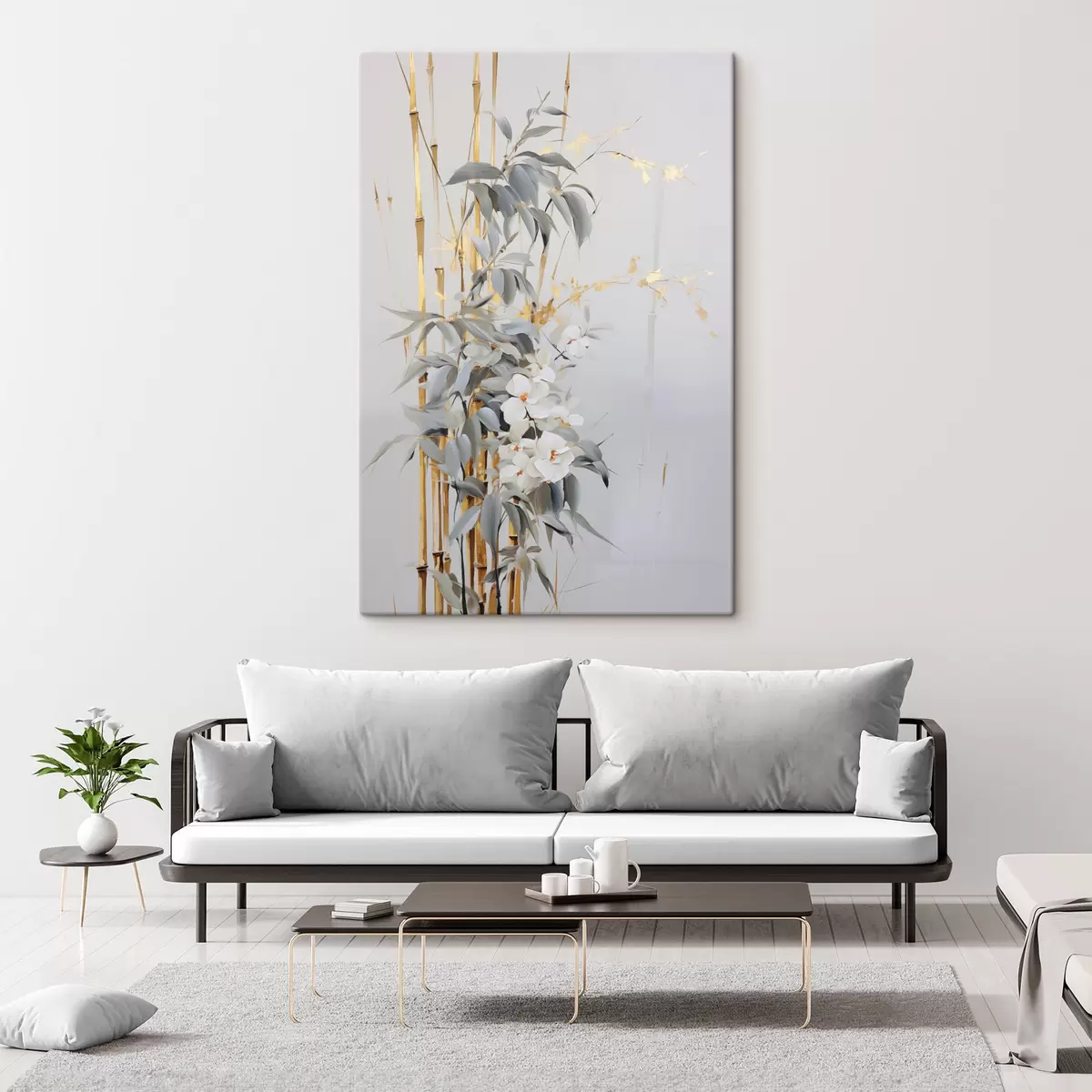 Wandbilder Abstrakte Bambusstämme mit gelben Akzenten, zarten weißen Blüten und hellgrünen Blättern, grauer Hintergrund s47038