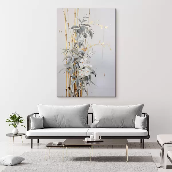 Wandbilder Abstrakte Bambusstämme mit gelben Akzenten, zarten weißen Blüten und hellgrünen Blättern, grauer Hintergrund Art. s47038