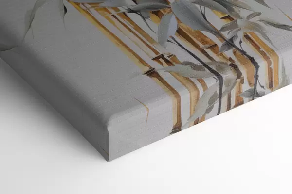 Wandbilder Abstrakte Bambusstämme mit gelben Akzenten, zarten weißen Blüten und hellgrünen Blättern, grauer Hintergrund Art. s47038