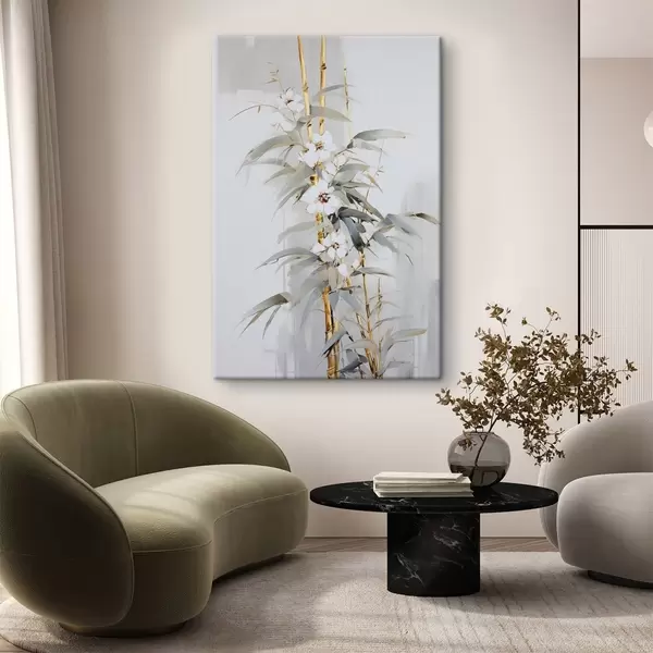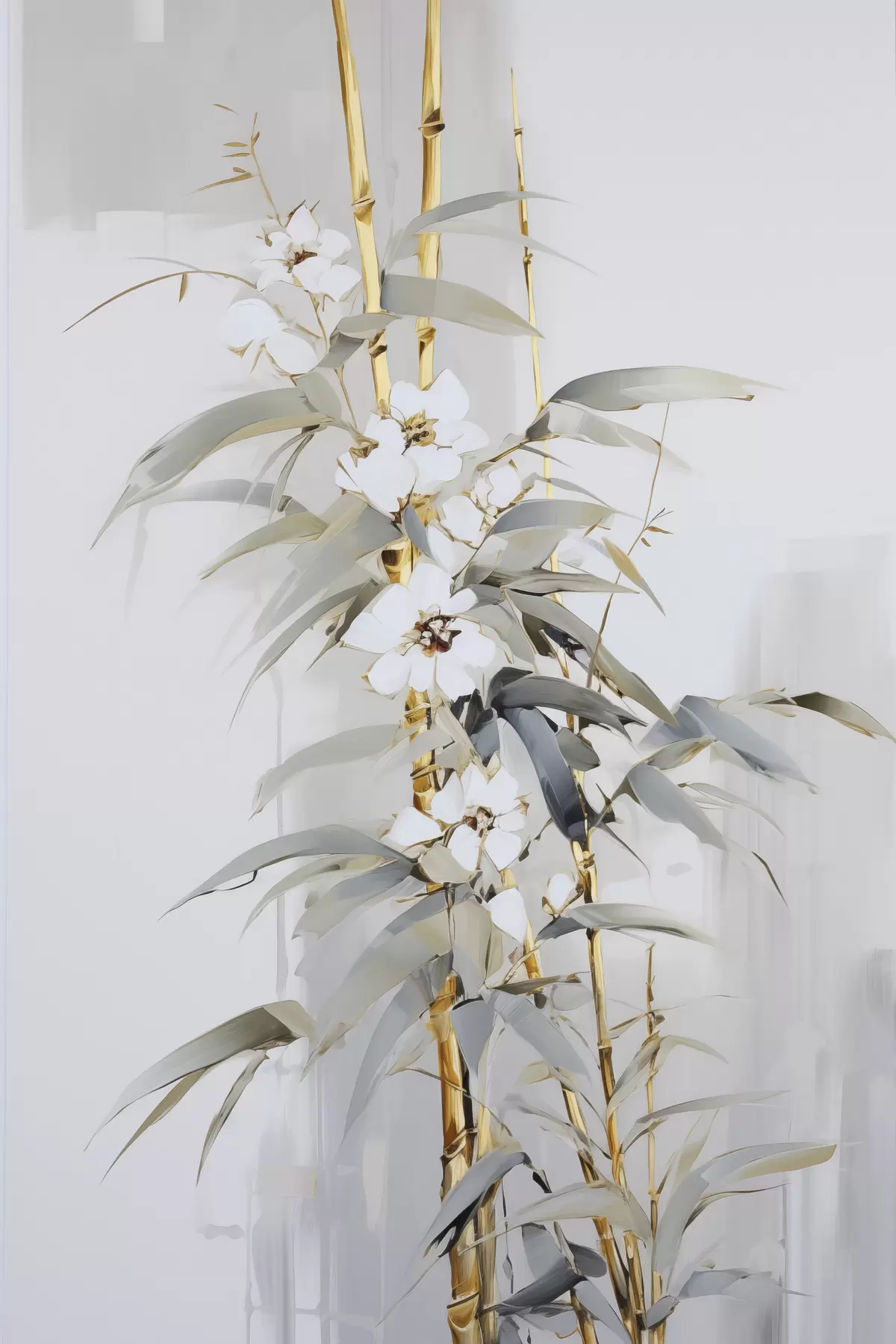 Wandbilder Abstrakte Bambusstämme mit gelben Akzenten, zarten weißen Blüten und hellgrünen Blättern, grauer Hintergrund Art. s47039