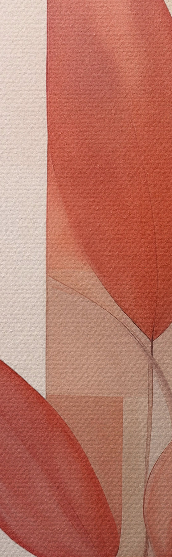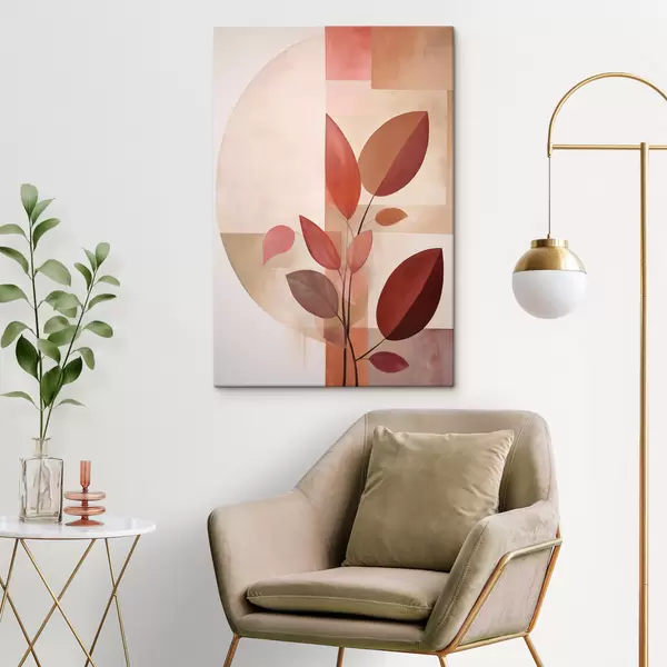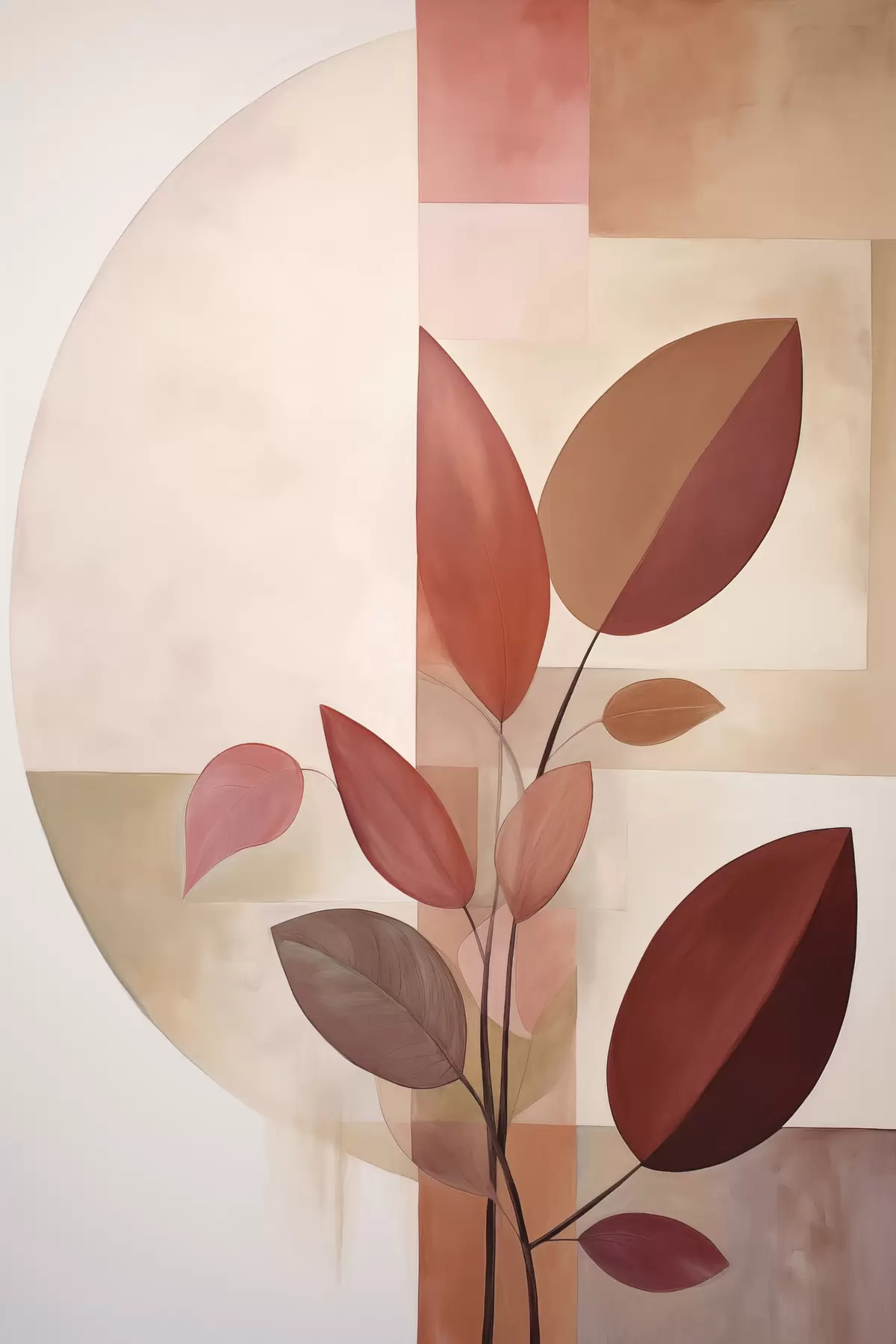 Wandbilder Abstrakte Pflanze mit roten Blättern vor einem Hintergrund aus geometrischen Formen und sanften, gedämpften Farben s47041