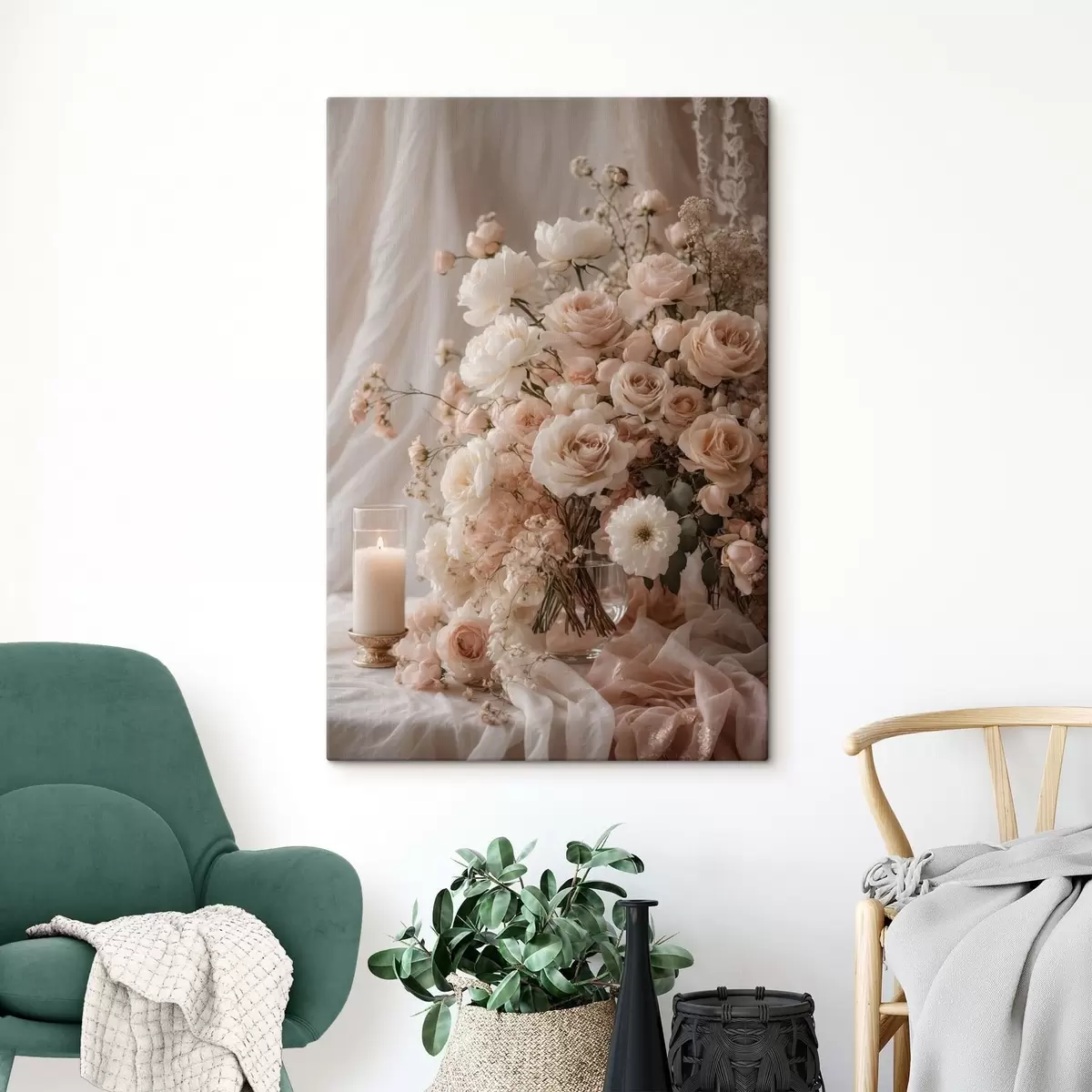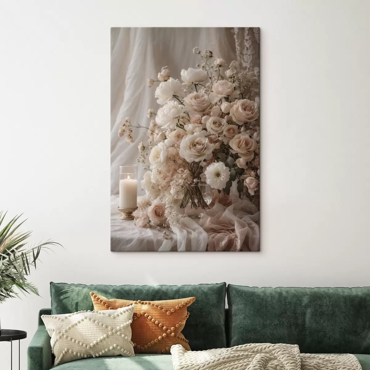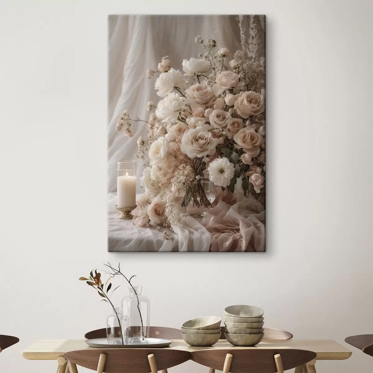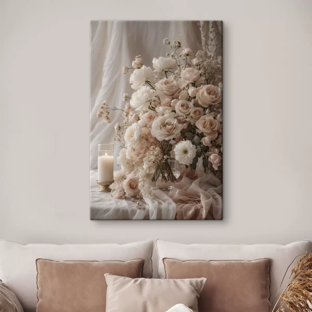 Wandbilder Cremefarbene Blumen neben einer brennenden Kerze Art. s47281