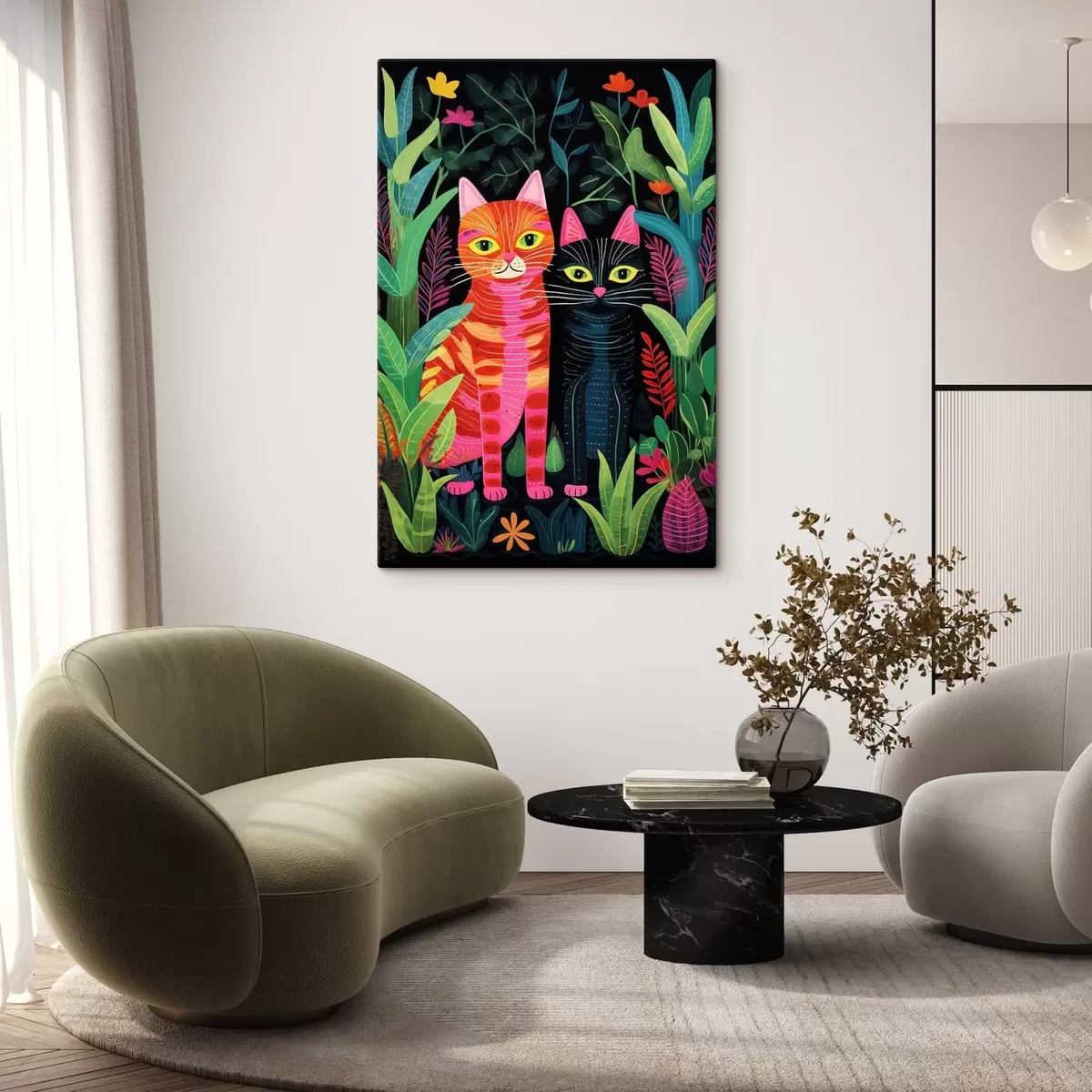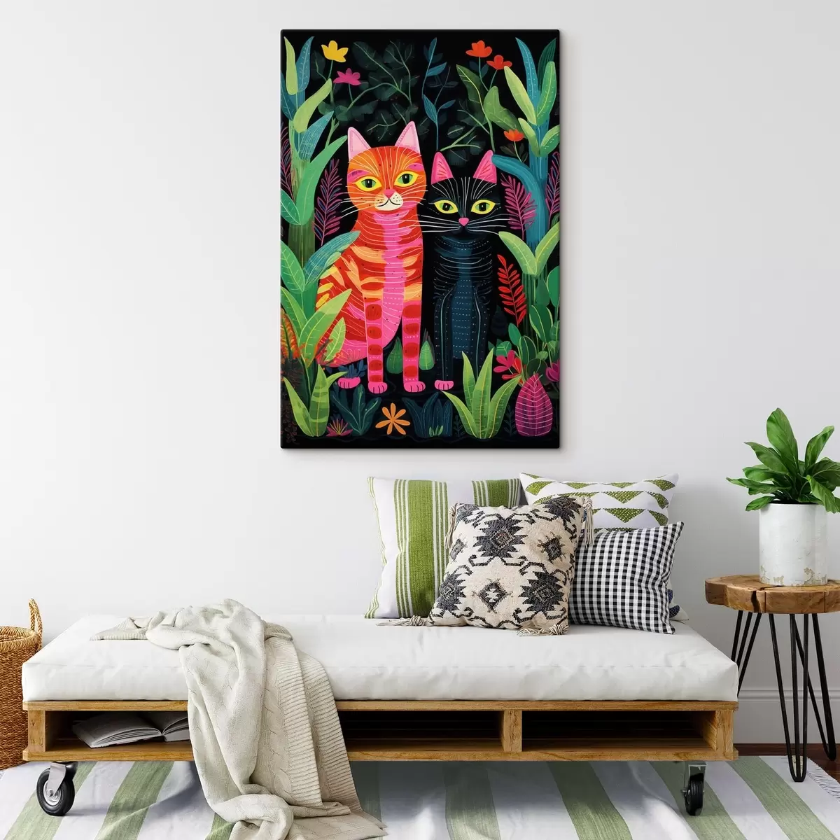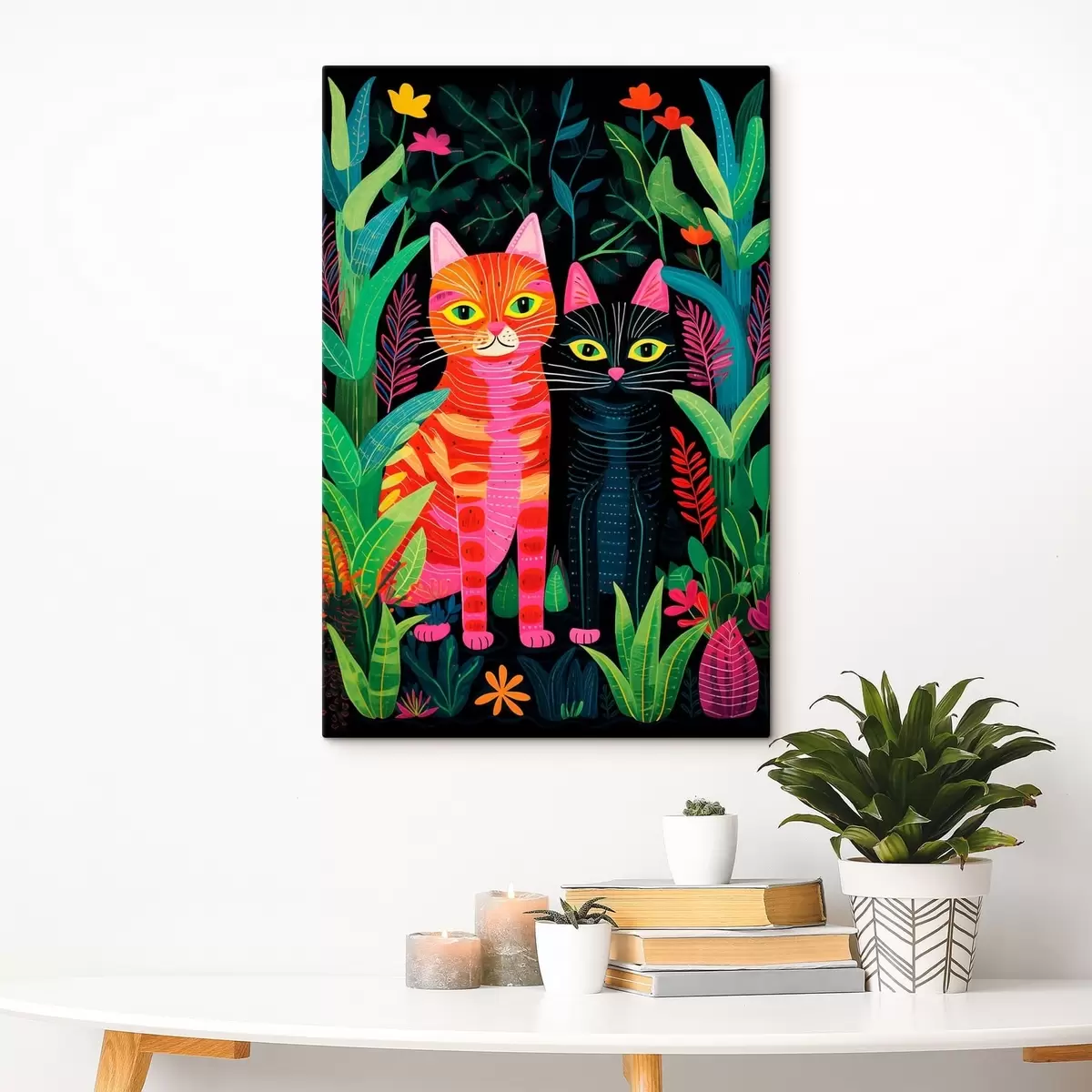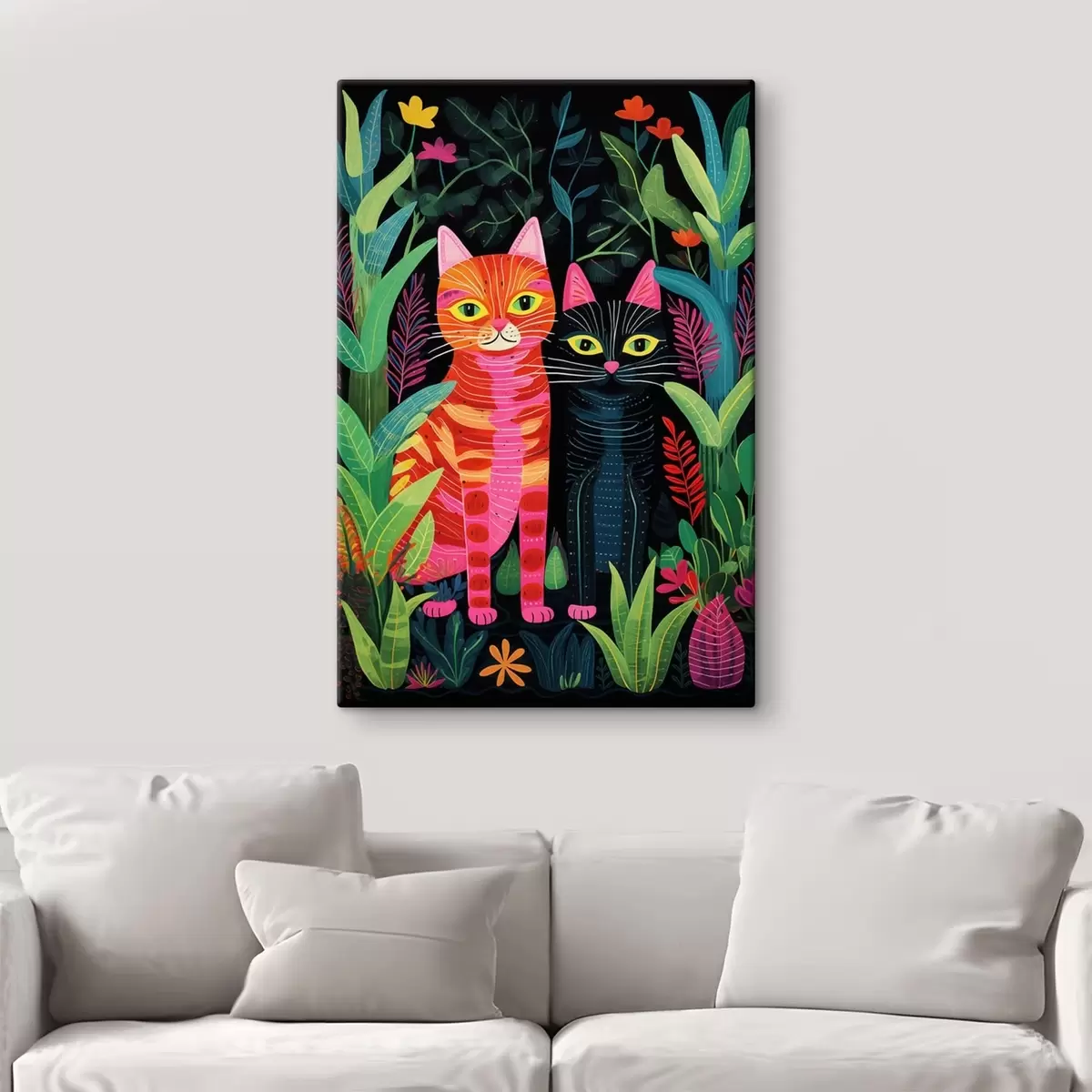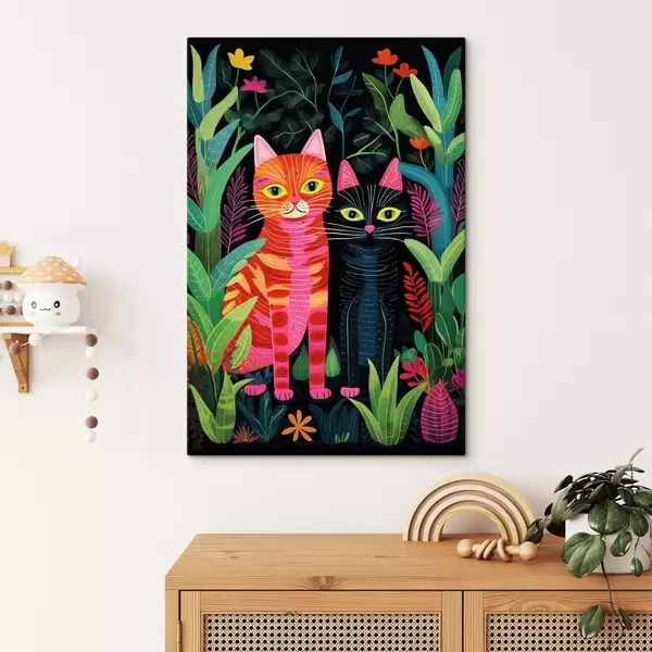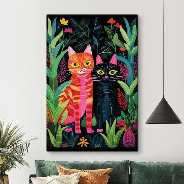 Wandbilder Zwei stilisierte Katzen zwischen lebhaften Pflanzen s47298