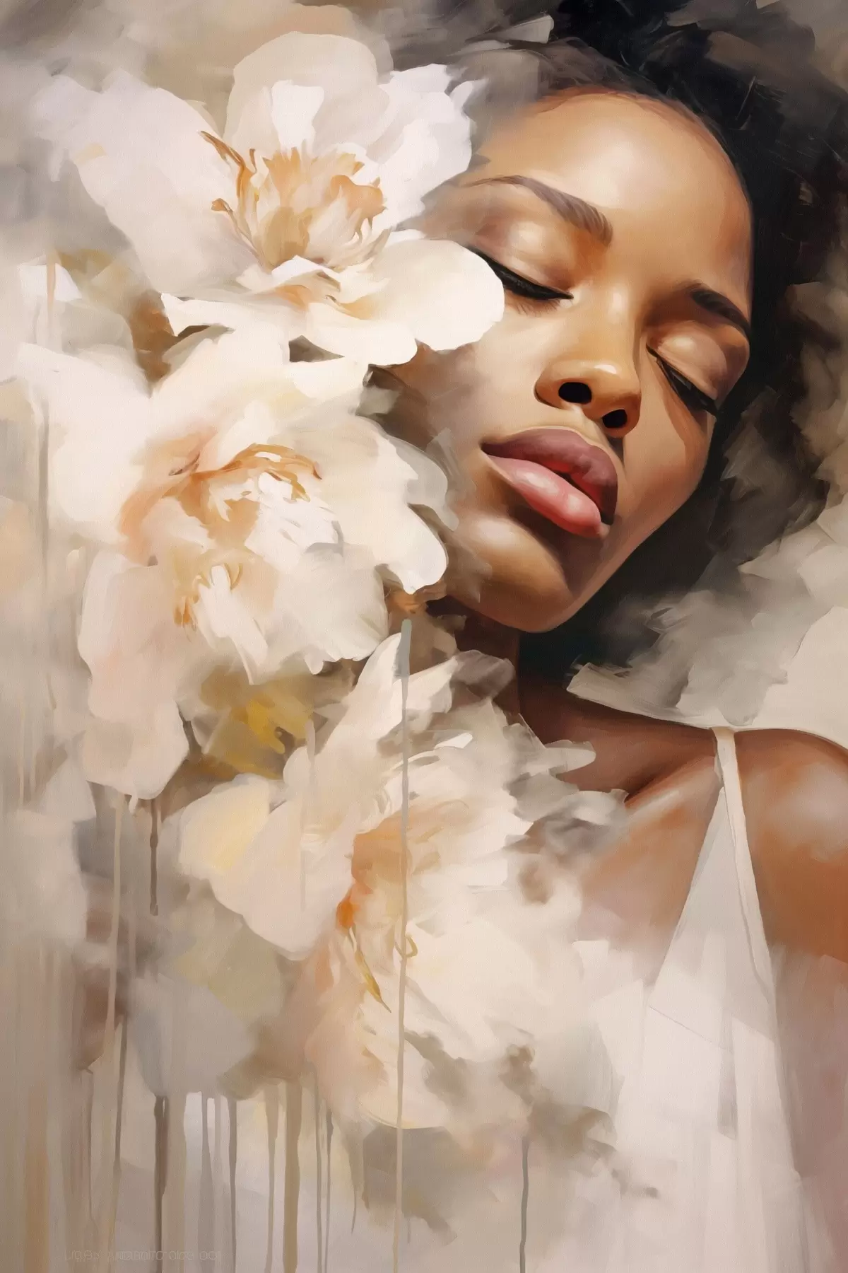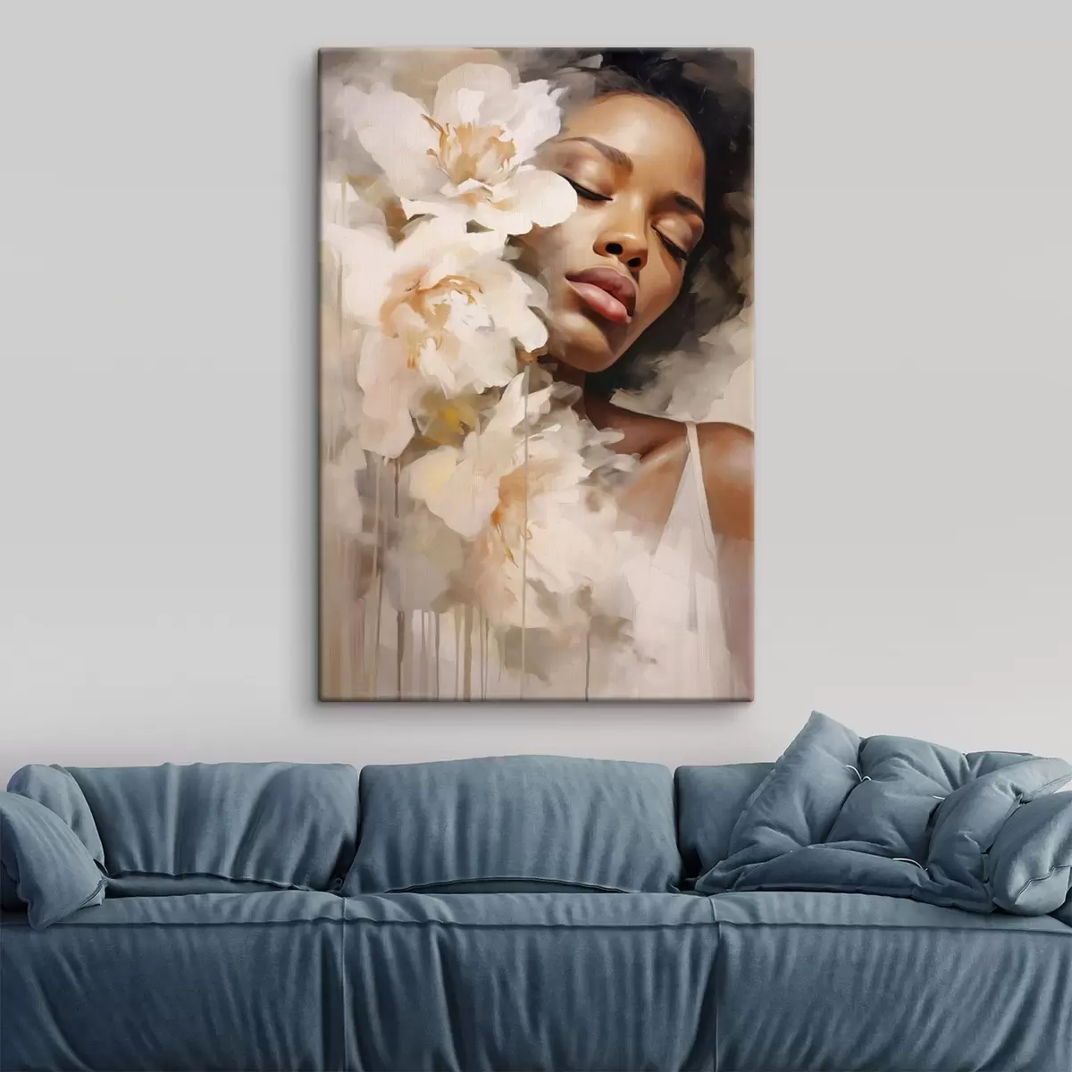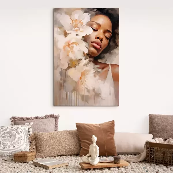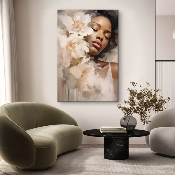 Wandbilder Frauenporträt neben großen Blumen s47307
