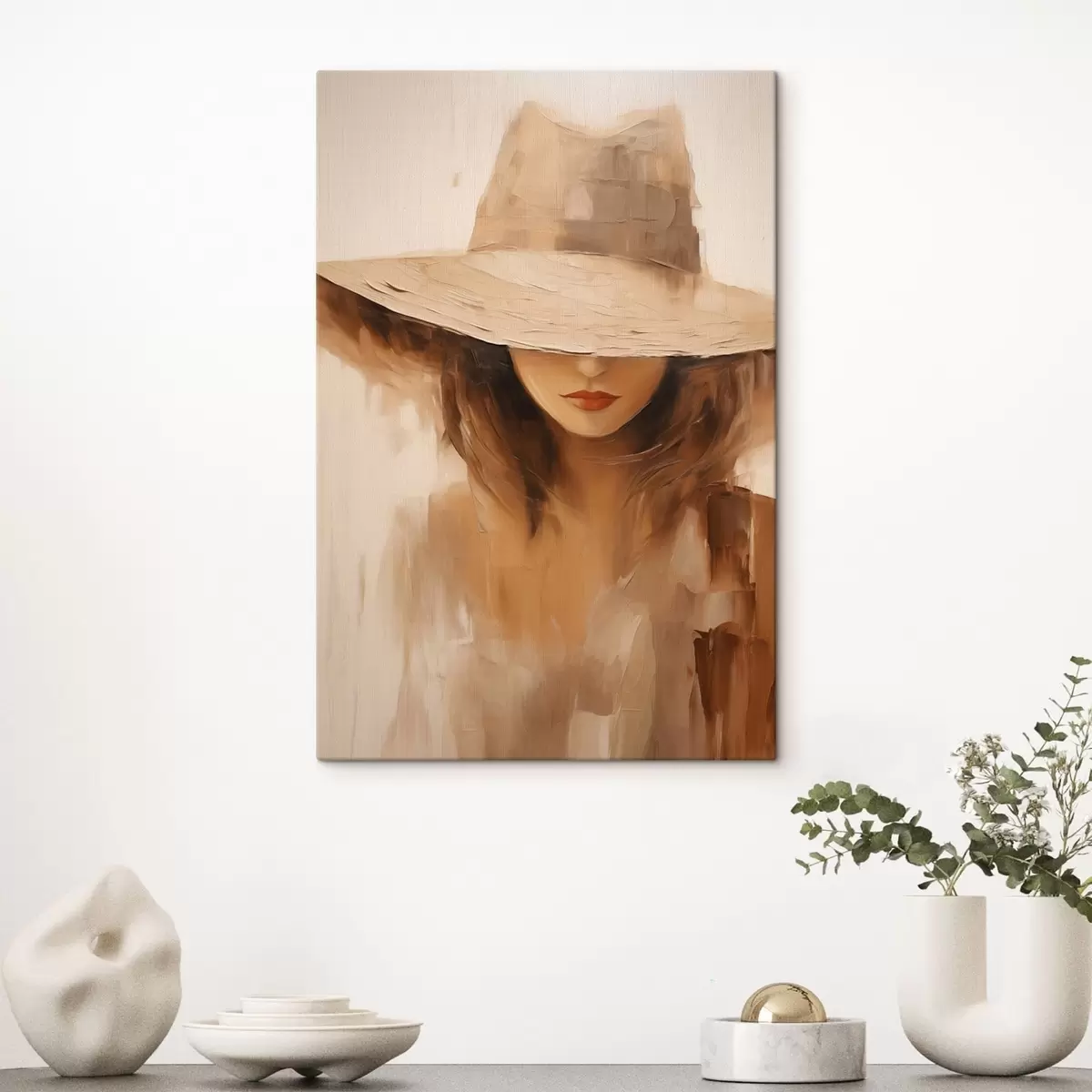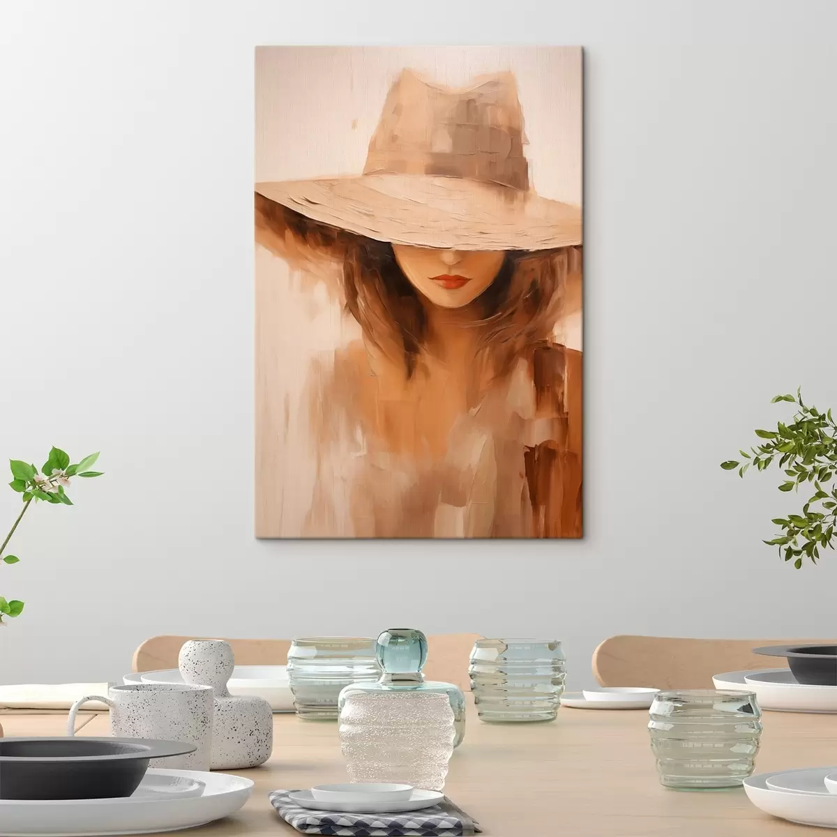 Wandbilder Frau mit Hut in warmen abstrakten Strichen s47312